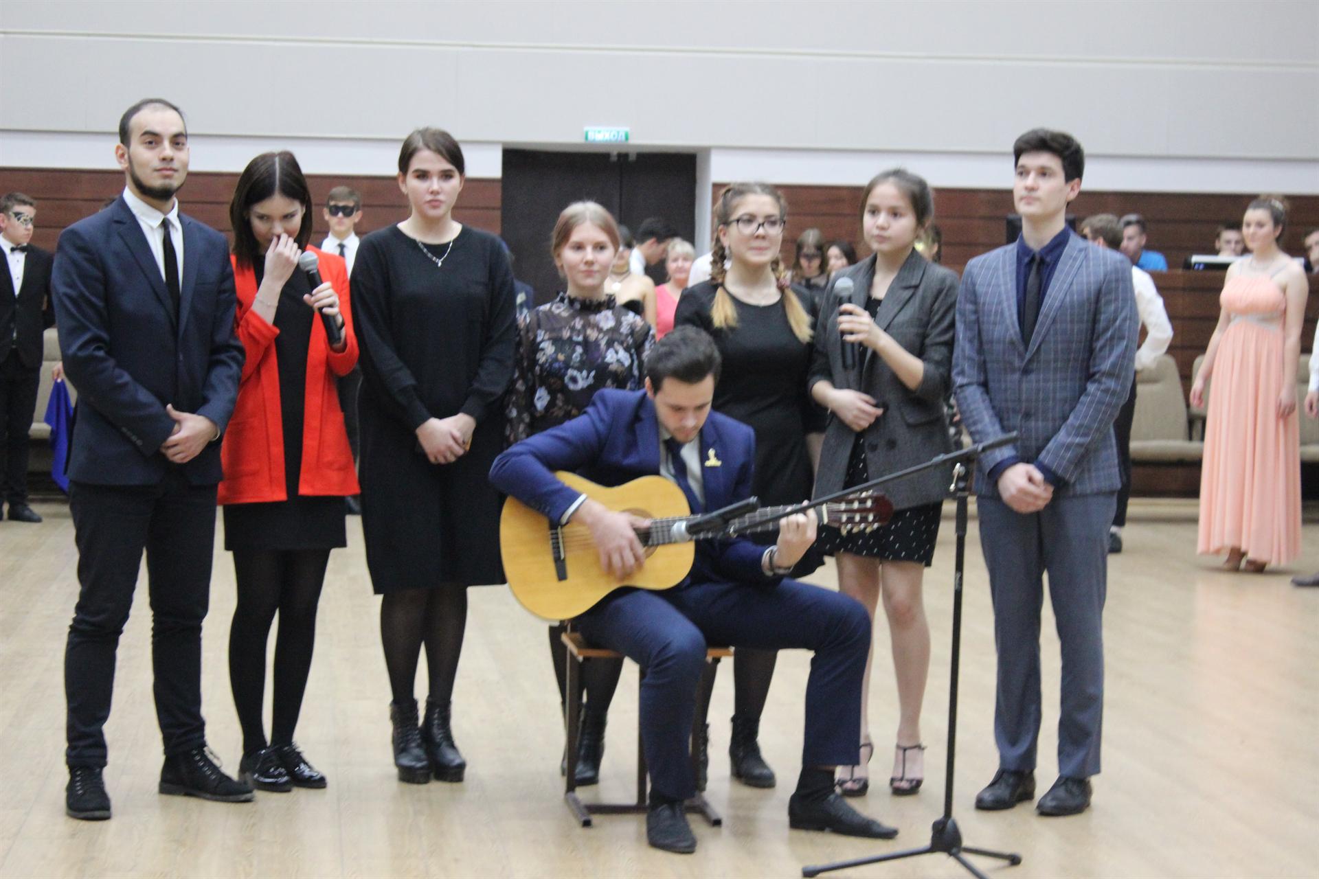 Далее последовал задорный танец полька-тройка. Быстрый темп и позитивное настроение окутали зал, пары с улыбками на лицах меняли позиции, создавая вокруг себя радость и счастье. А затем, вновь возвращая нас к атмосфере гармонии и спокойствия, выступил студенческий ансамбль, исполнив лирическую песню под гитару.