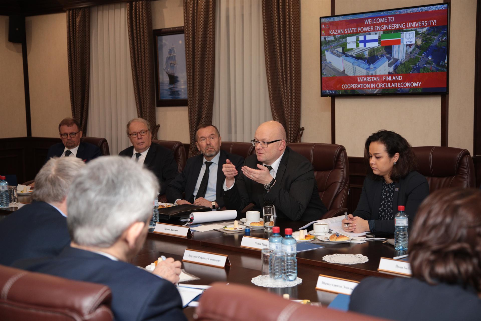 Члены делегации Финляндии выразили понимание, что КГЭУ несет особую миссию в этом деле, потому что это профильный энергетический вуз, который готовит энергетиков нового поколения, и здесь они могут брать на вооружение новые технологии, связанные с циркулярной экономикой. В своих выступлениях это подчеркнули старший советник Финского инвестиционного фонда Ситра Тимо Макела ипочетный председатель Татарской общины Финляндии Окан Дахер.