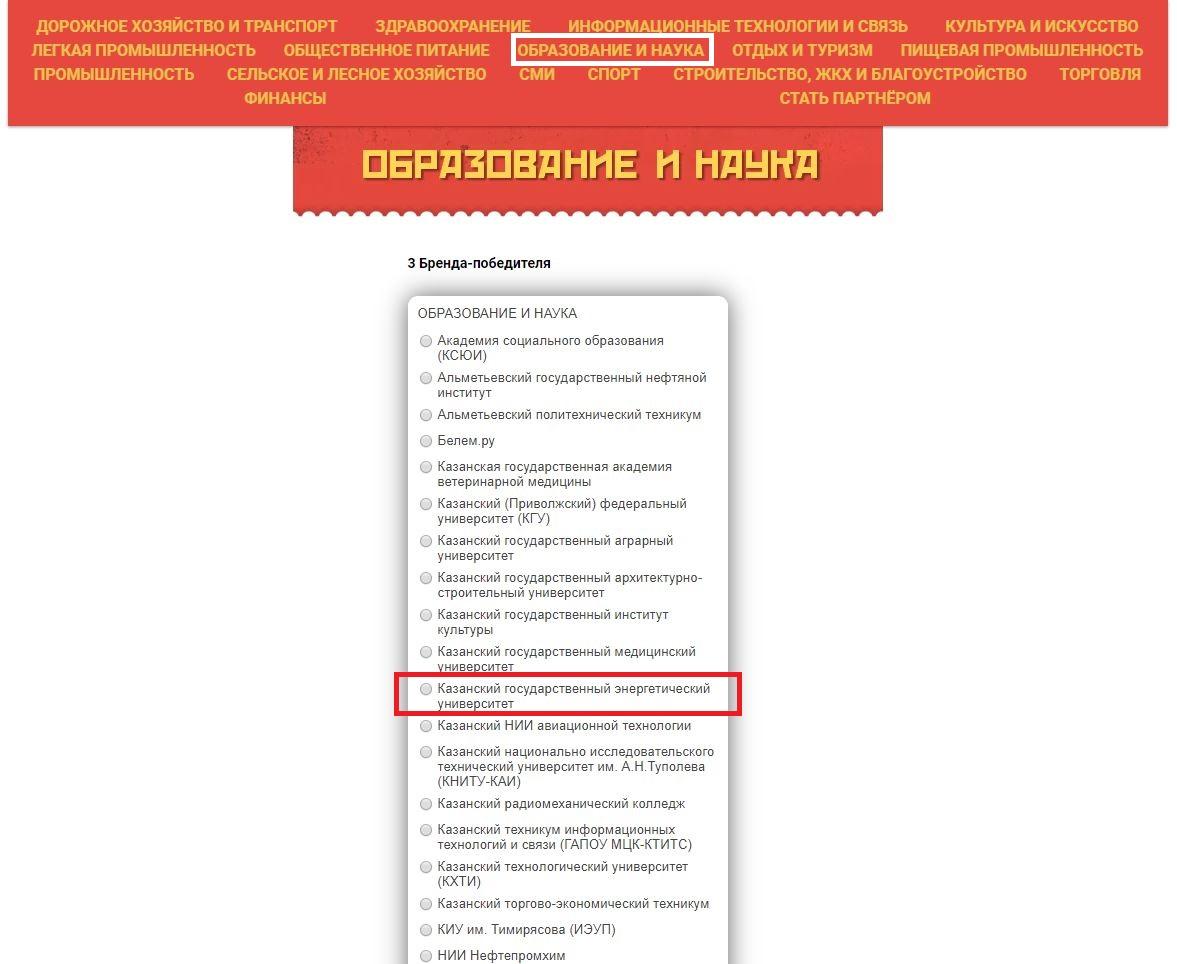 Для того чтобы проголосовать за Казанский государственный энергетический университет, необходимо выбрать отрасль "Образование и наука".