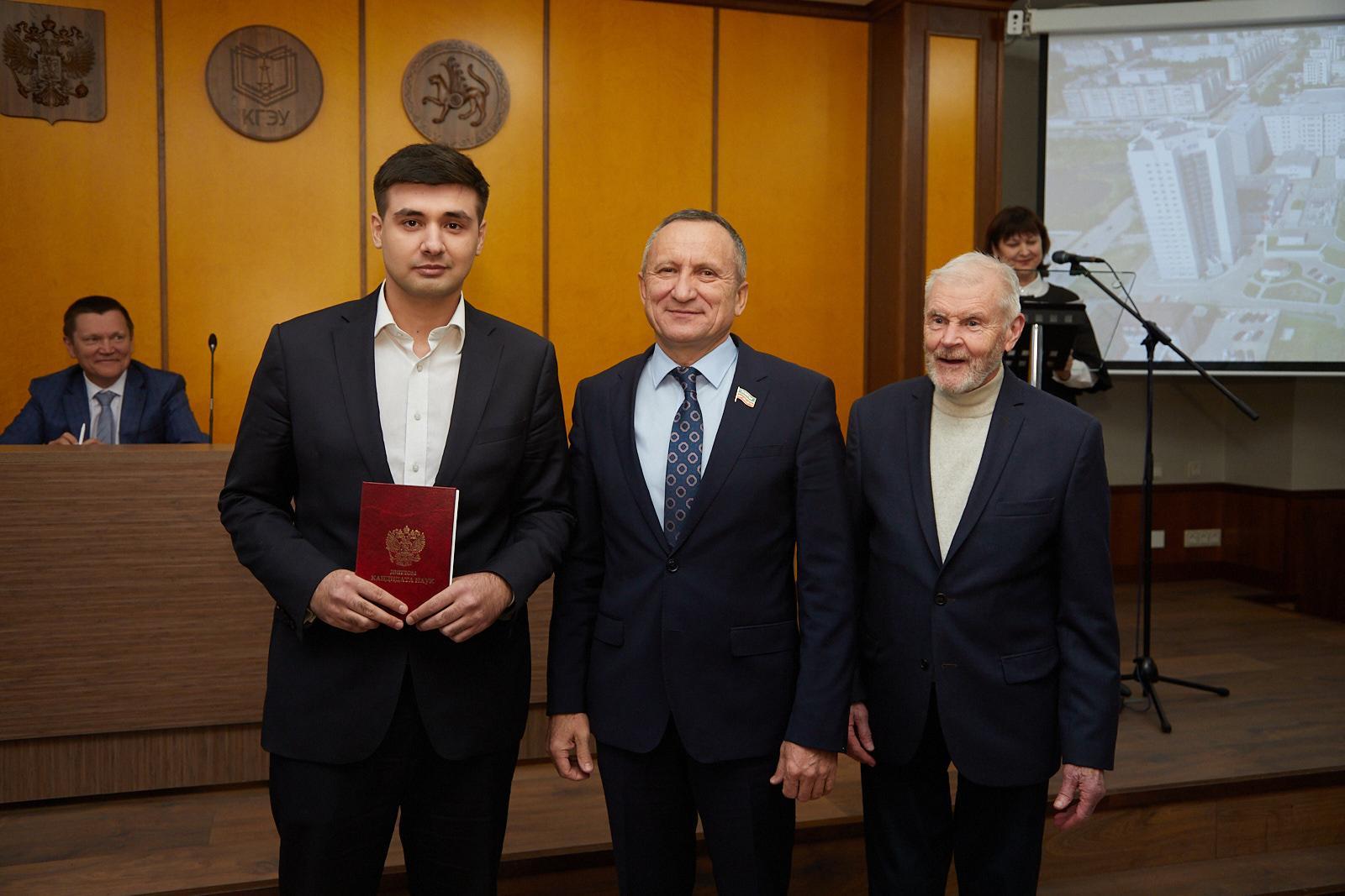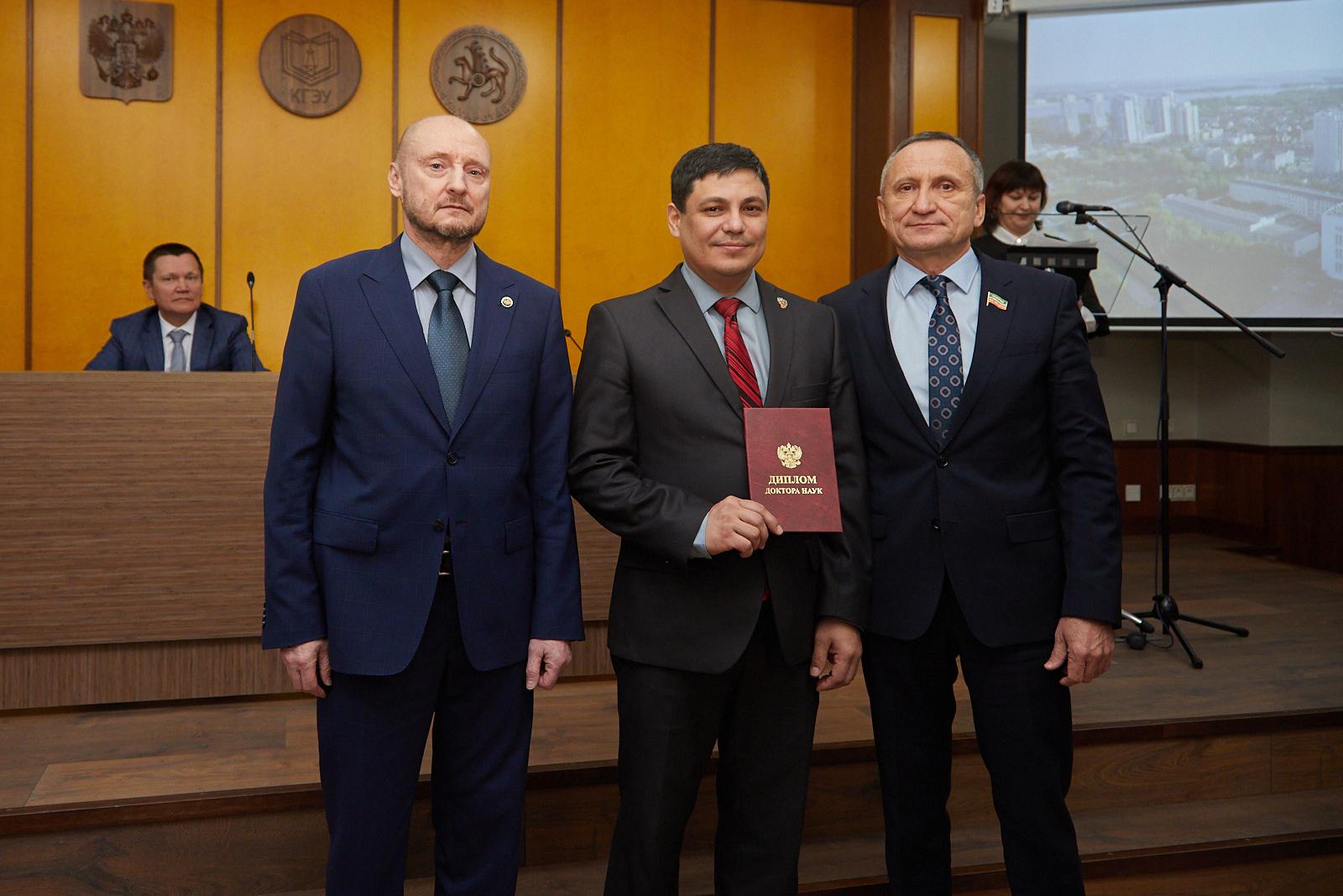 Диплом доктора технических наук ректор вручил Марату Садыкову (Научный консультант - доктор физико-математических наук, профессор, заведующий кафедрой «Промышленная электроника и светотехника» КГЭУ Александр Голенищев-Кутузов).