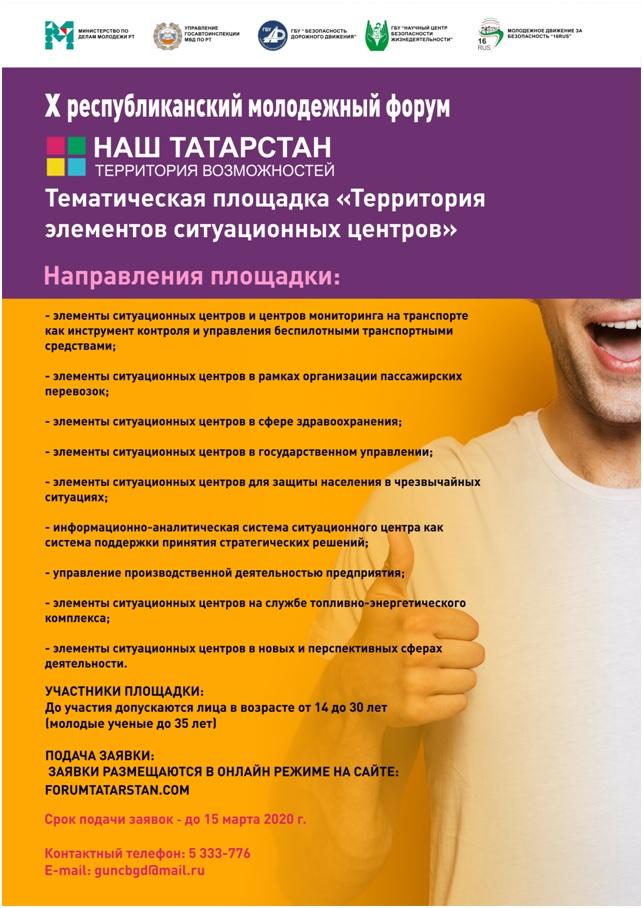 Вы можете подать заявку на тематическую площадку "Территория элементов ситуационных центров" X Республиканского молодежного форума "Наш Татарстан" до 15 марта 2020 года.