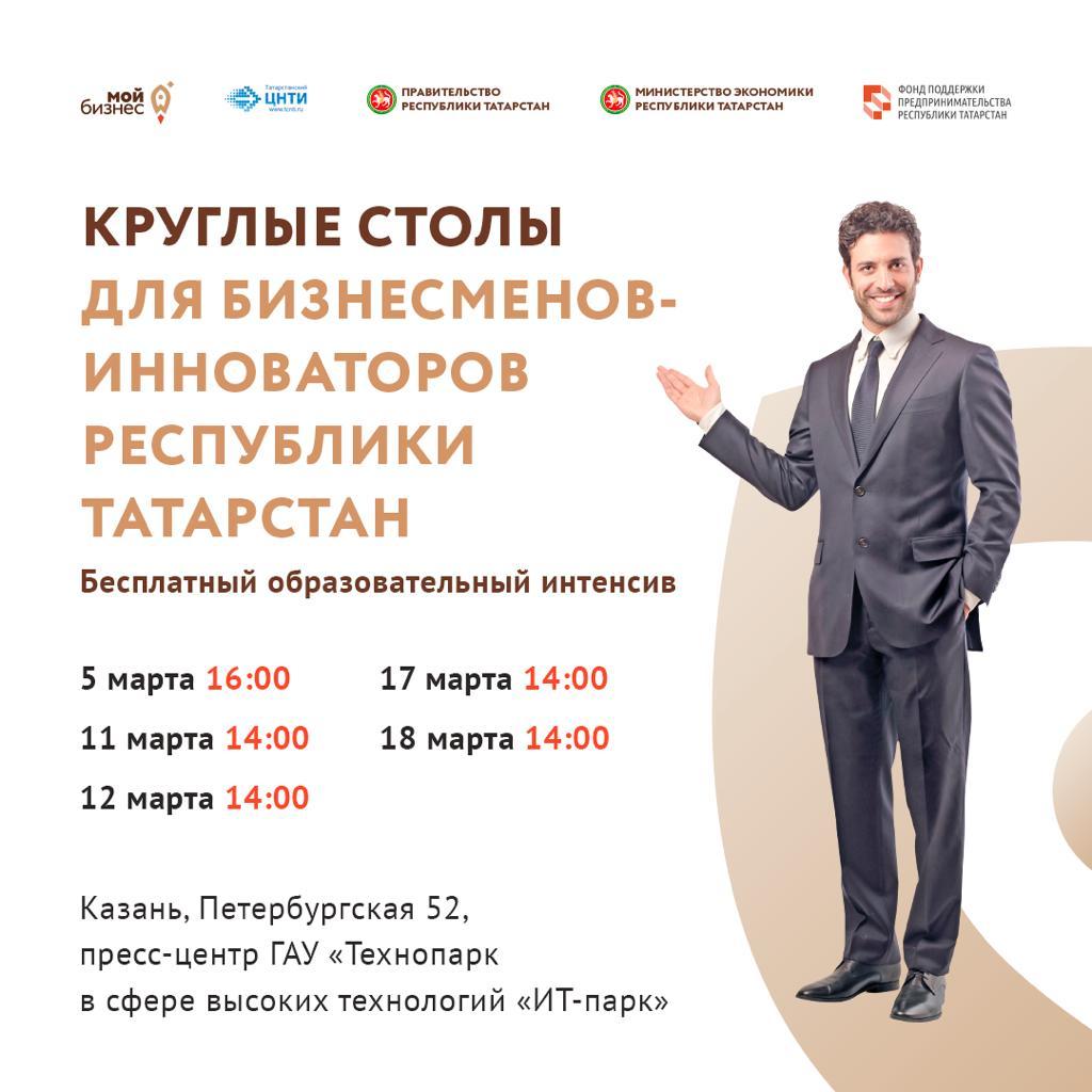 5,11,12, 17 и 18 марта в пресс-центре Технопарка в сфере высоких технологий "ИТ-парк" пройдет серия бесплатных интенсивов в формате круглых столов для инноваторов - субъектов малого и среднего предпринимательства, а также лиц, планирующих начать предпринимательскую деятельность по вопросам развития сферы инновационной деятельности в Республике Татарстан.