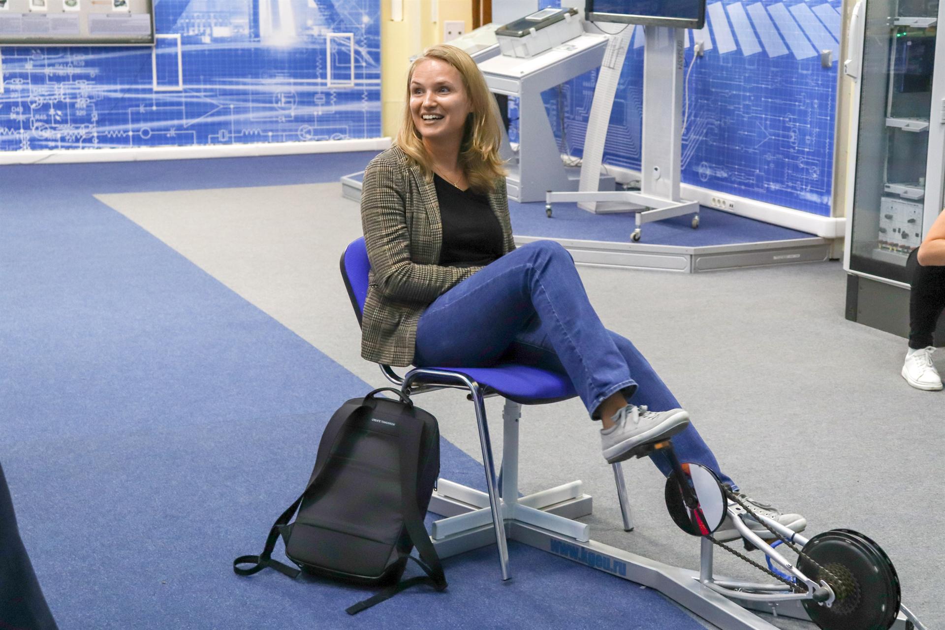 Особенно понравился Дарье Герасименко велогенератор, разработанный студентами КГЭУ, мощности которого хватает, чтобы зарядить телефон или компьютер. Она с удовольствием лично протестировала устройство и предложила обязательно внедрять его в жизнь, после того, как дизайнер придаст опытному образцу товарный вид.