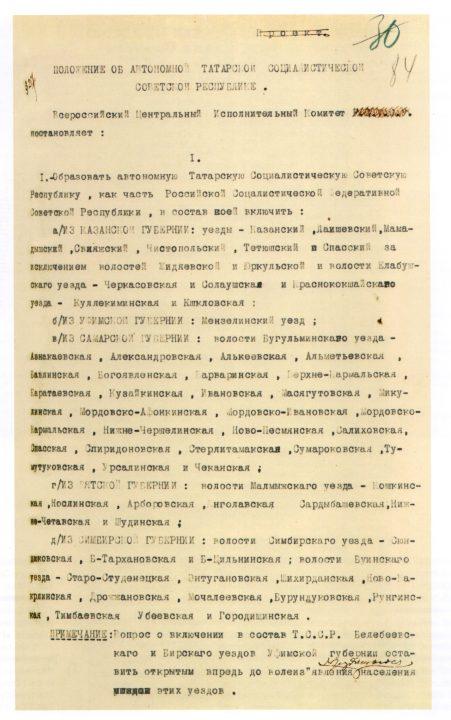 27 мая 1920 года был издан Декрет об образовании ТАССР, подписанный председателем Совнаркома Владимиром Лениным, председателем Всероссийского Центрального Исполнительного комитета Михаилом Калининым и секретарем ВЦИК Авелем Енукидзе.