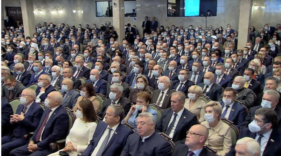 В зал внесли Конституцию РФ, Конституцию РТ и Штандарт президента Республики Татарстан. Рустам Минниханов принес присягу на верность многонациональному народу республики.