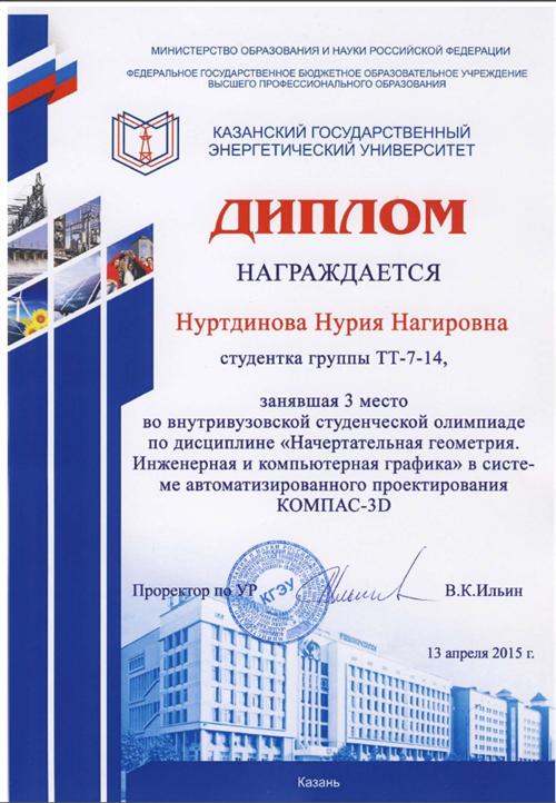 Третье место - Нуртдинова Нурия Нагировна, гр. ТТ-7-14