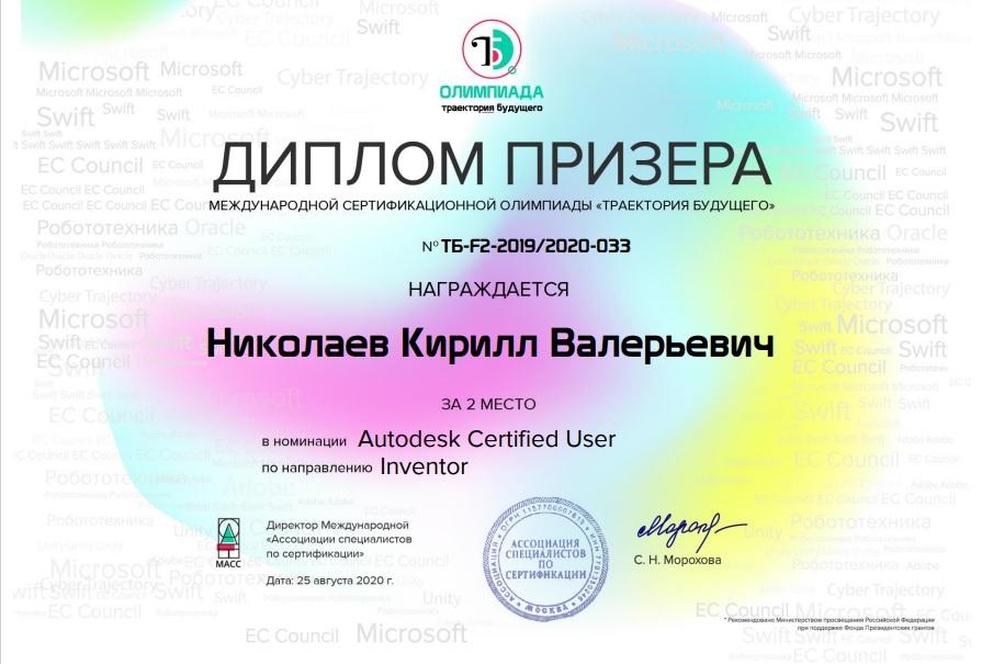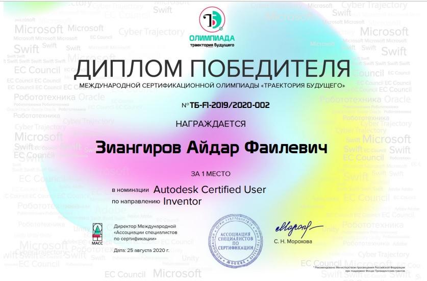 Студенты КГЭУ заняли первое (Айдар Зиангиров, гр. ЭC-1-19) и второе (Кирилл Николаев, гр. АУС-2-17) места под руководством зав. каф. "Инженерная графика" В.А. Рукавишникова на международной олимпиаде «Траектория будущего» по номинации Autodesk Certified (направление Inventor).