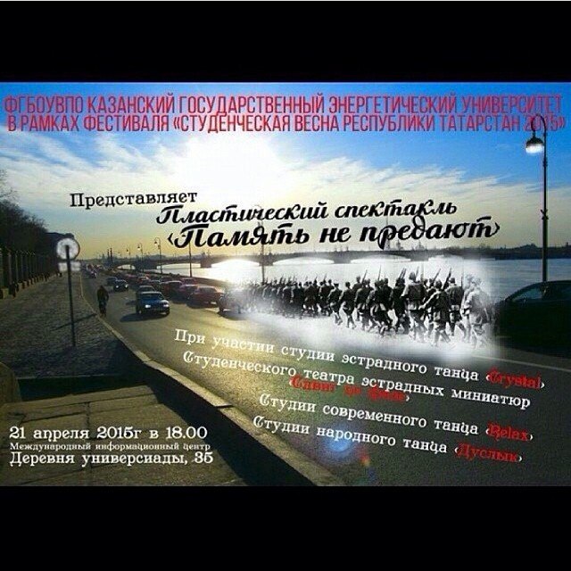 21 апреля в 18:00 в концертном зале МИЦ (Деревня Универсиады, д.35) творческие коллективы КГЭУ представят пластический спектакль "Память не предают" в рамках фестиваля "Студенческая Весна Республики Татарстан-2015".
