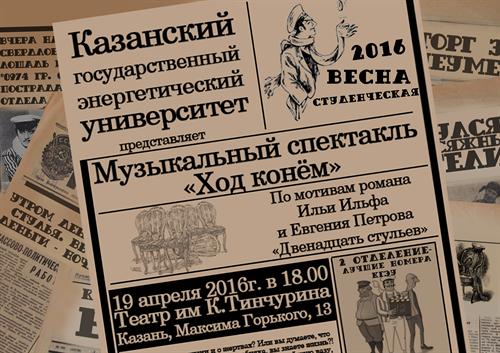 Вся программа состоит из двух отделений. В первом, конкурсном, коллективы Студенческого клуба представят зрителям музыкальный спектакль «Ход конём» по мотивам романа Ильфа и Петрова «Двенадцать стульев». Во втором мы станем свидетелями лучших творческих номеров Студенческого клуба КГЭУ! Общая продолжительность мероприятия составит около 2.5 часов.