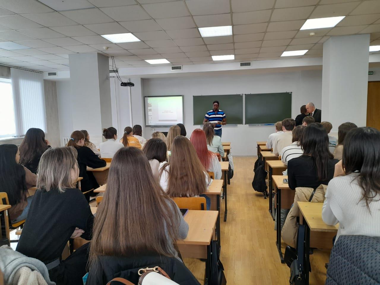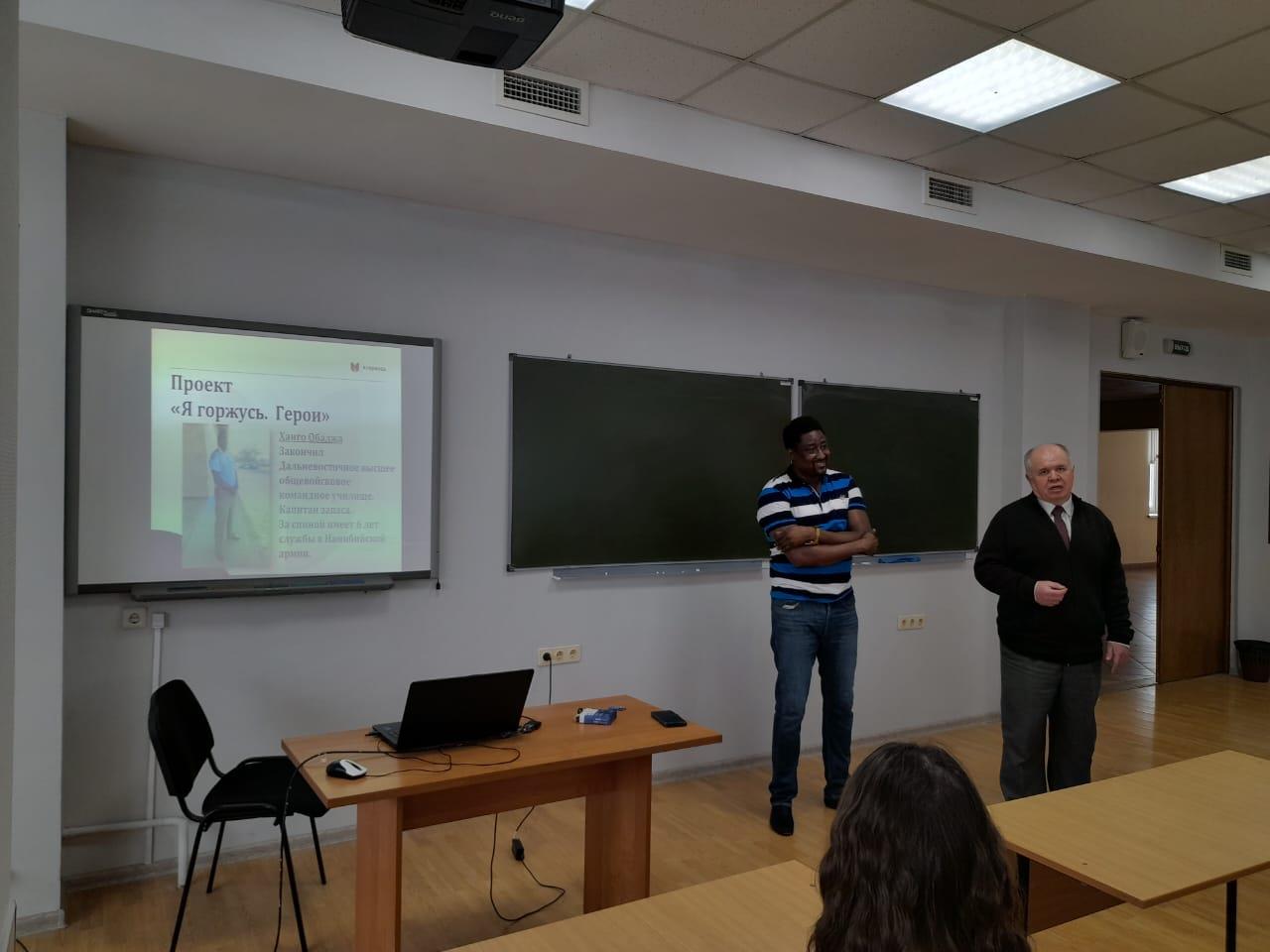 А еще он в свое время закончил Дальневосточное высшее военное командное училище, служил в армии Намибии и дослужился до капитана. Гость подготовил презентацию и в очень образной, эмоциональной манере рассказал о своей стране, ее традициях, о своей службе в армии. Студенты очень внимательно слушали выступающего, задавали ему вопросы. Например, что для него означает патриотизм, кем он хочет стать после окончания университета. Ханго Обаджо сказал, что мечтает стать учителем, что в Намибии до сих пор тепло вспоминаю дружескую помощь СССР, и нынешней России. У него всегда с собой флаг страны и для него патриотизм-это любовь к Родине, к семье, друзьям и готовность защитить ее в трудные моменты.