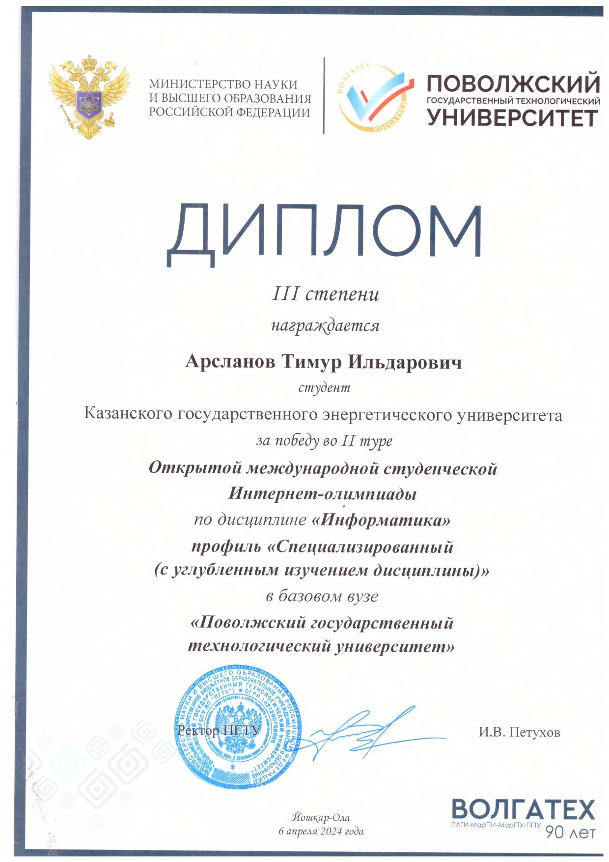 Студент группы ТРП-1-23 кафедры «Информационных технологий и интеллектуальных систем» Тимур Арсланов занял призовое место и получил диплом III степени.