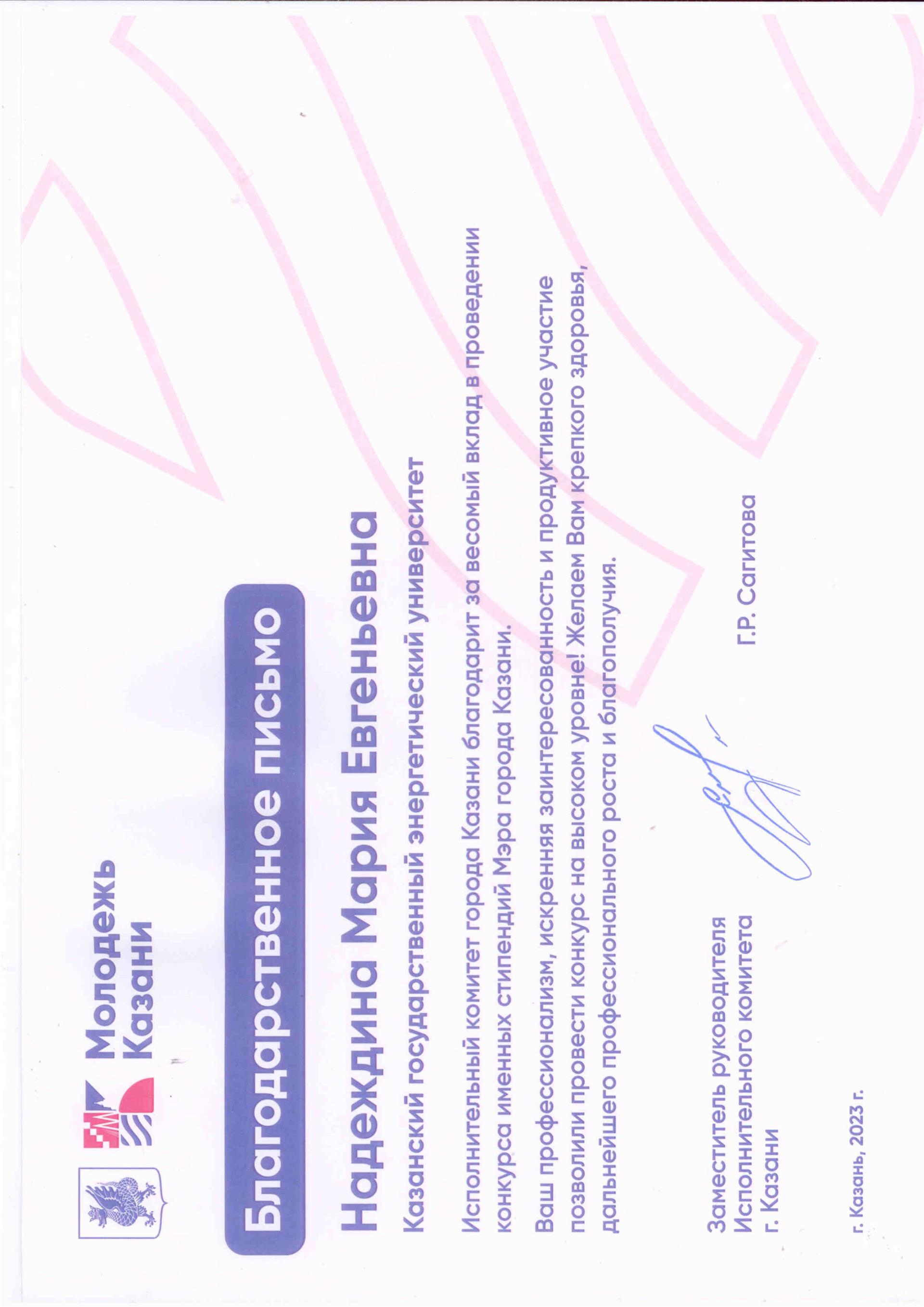 Надеждиной Марие Евгеньевне вручена благодарность за весомый вклад в проведени конкурса именных стипендий Мэра города Казани.