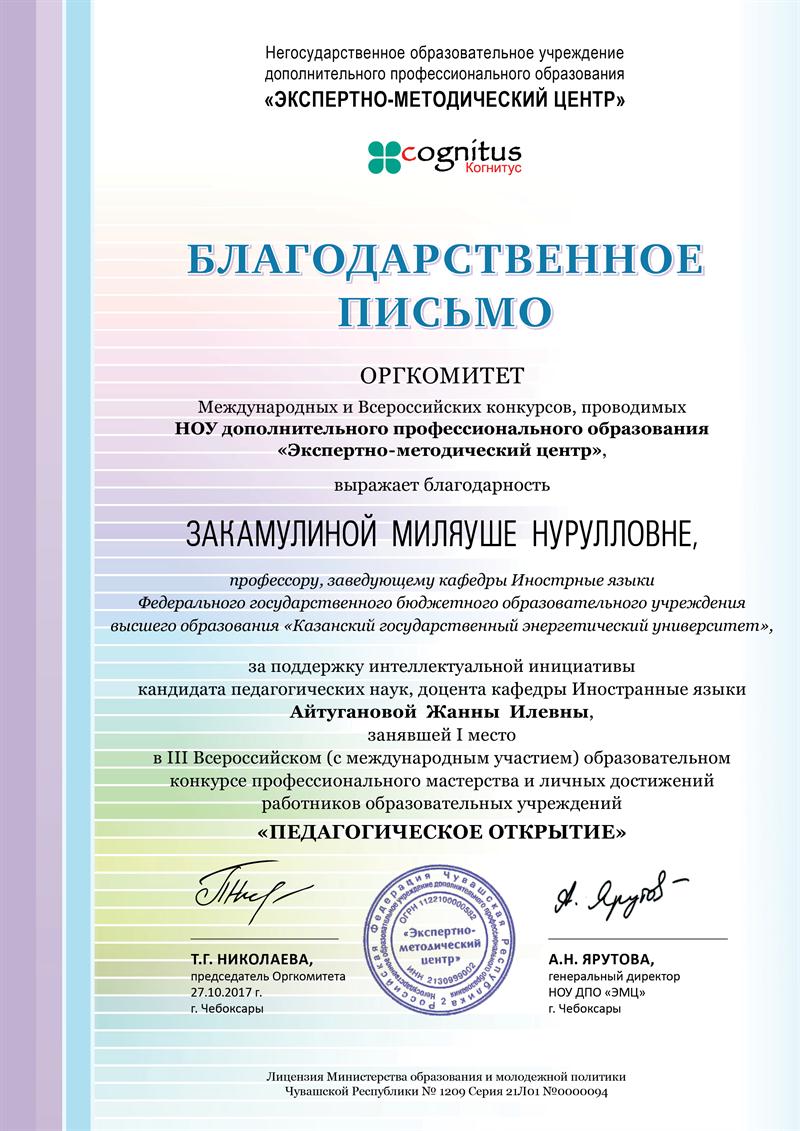 Жанной Айтугановой конкурс была представлена учебно-методическая работа: Видео занятие на английском языке для бакалавров «GreatBritain. Industry in the UK». Работа транслировалась на Всероссийском уровне.