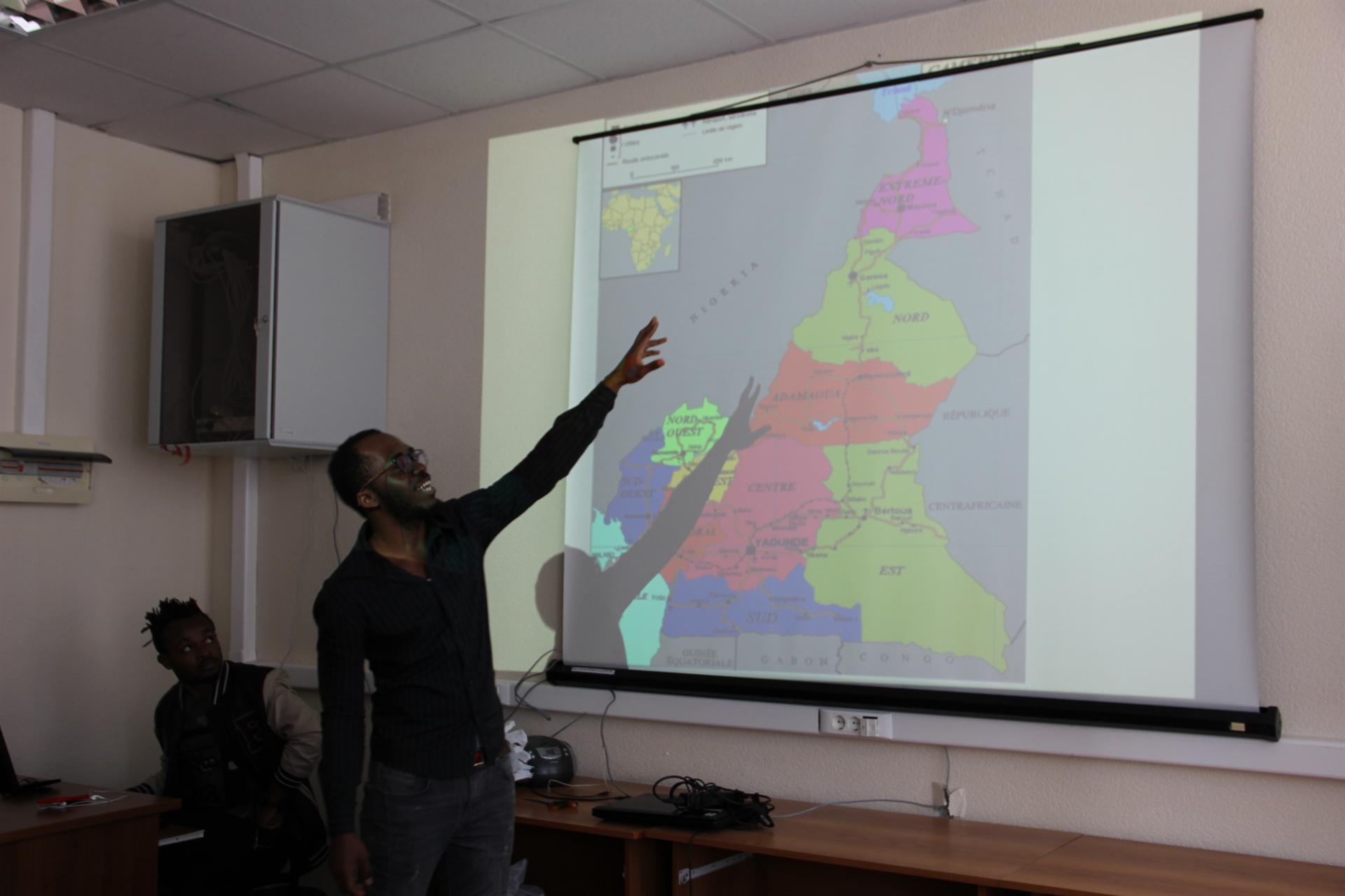 А вчера студенты, изучающие французский язык, с большим интересом прослушали выступление Эрика Батума и Нжоку Нренгу, приехавших из Камеруна. Ребята рассказали о своей стране, о языках, на которых говорят жители страны, о культурных особенностях регионов Камеруна и старинных традициях. Для этих студентов французский язык является родным наряду с языком их племени. В Камеруне, так же, как и в ряде других стран Африки, французский язык сохранился в качестве языка системы образования. Но студенты также хорошо владеют и английским языком. Кроме этих двух обязательных языков, французского и английского, в лицеях для изучения им предлагаются на выбор еще немецкий, испанский или итальянский языки, а с недавних пор и китайский. Эта часть рассказа камерунцев вызвала среди наших студентов большое оживление.
