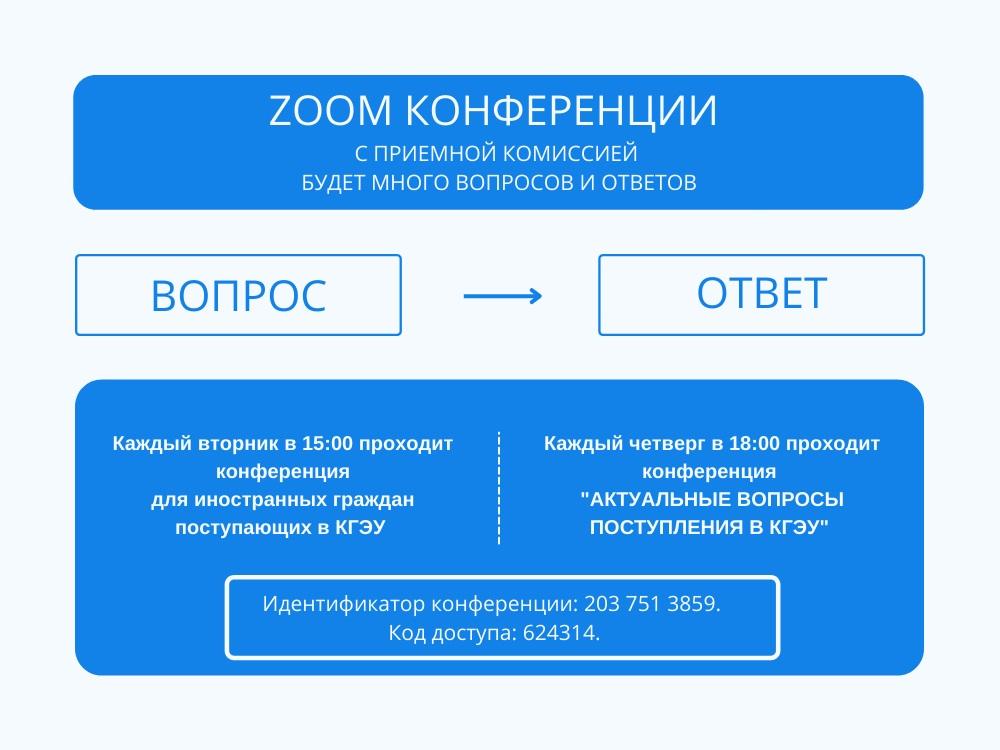 Каждый четверг в 18:00 проходит ZOOM конференция "АКТУАЛЬНЫЕ ВОПРОСЫ ПОСТУПЛЕНИЯ В КГЭУ" для абитуриентов.