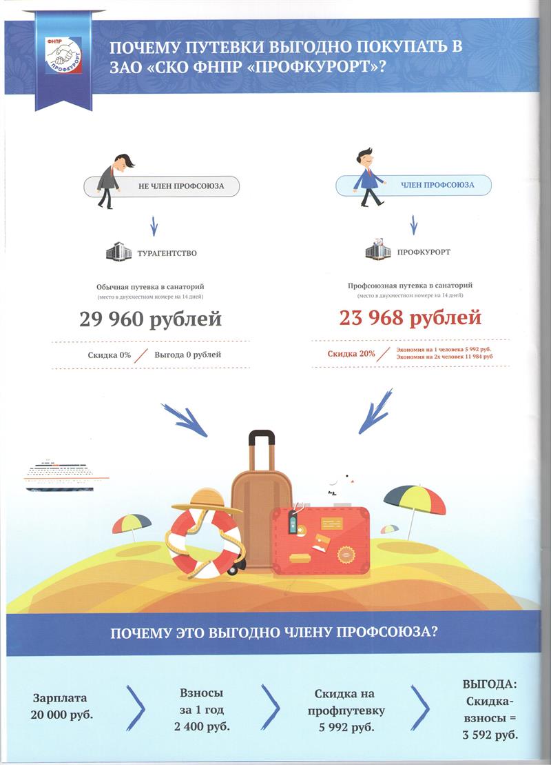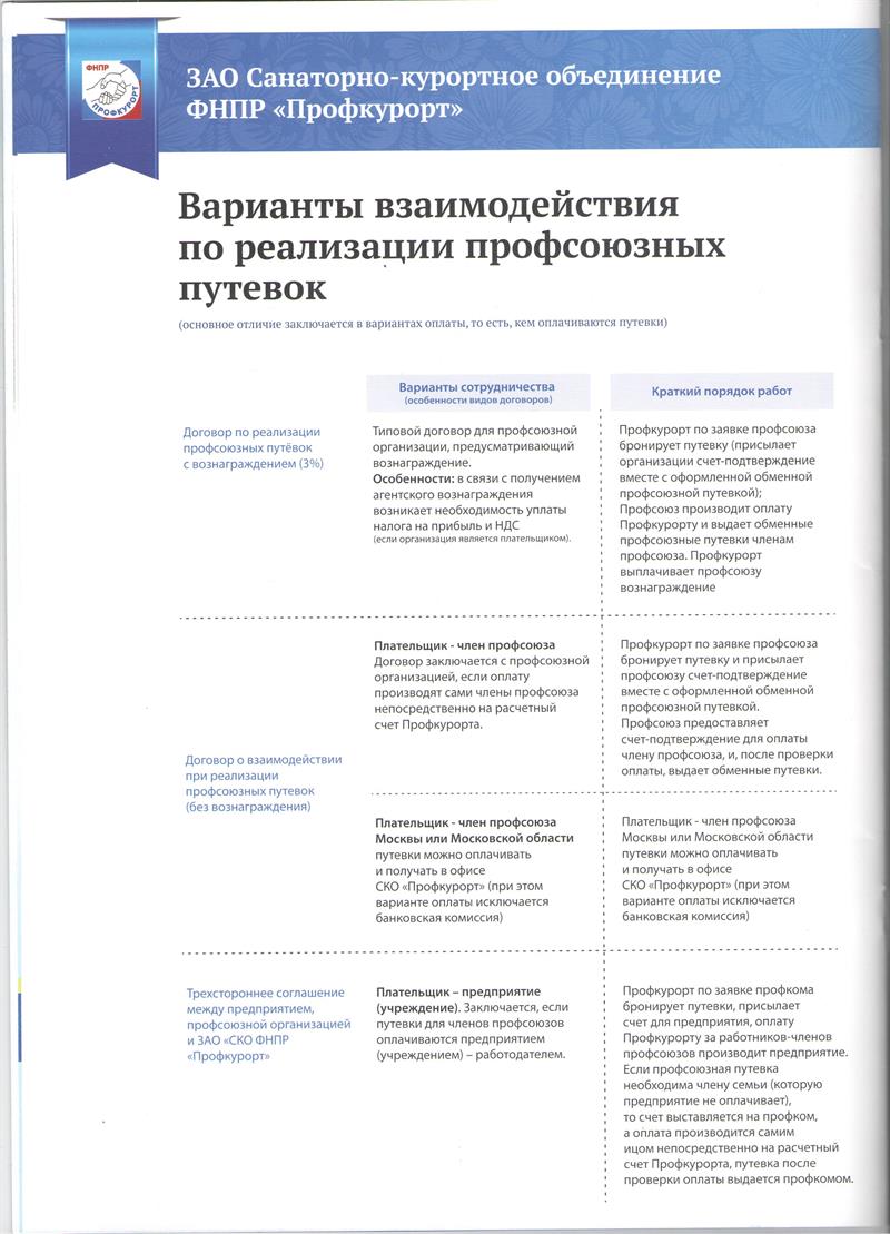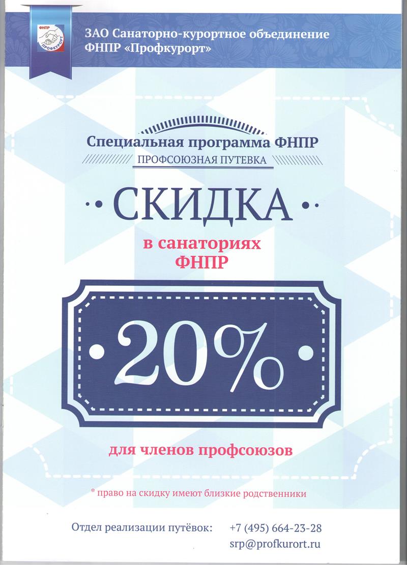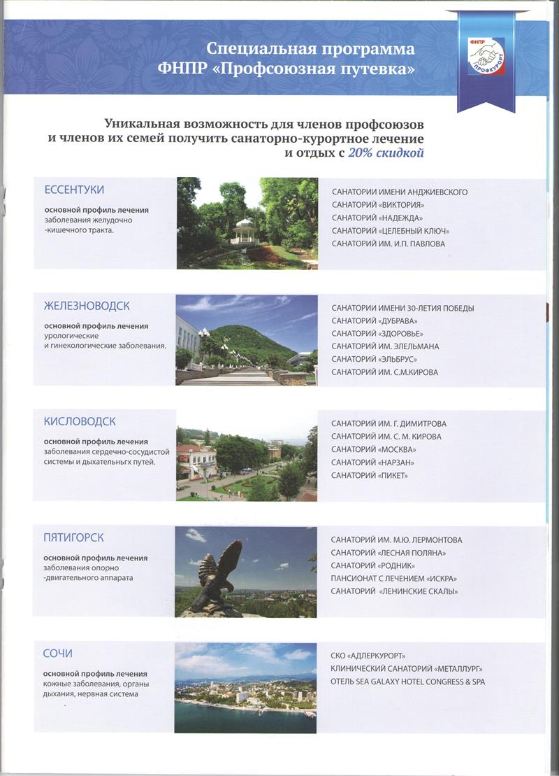 ЗАО «САНАТОРНО-КУРОРТНОЕ ОБЪЕДИНЕНИЕ ФНПР «ПРОФКУРОРТ» предлагает организацию отдыха в течении всего года по специальной программе ФНПР "Профсоюзная путевка" со скидкой 20% для членов профсоюза в лучшие санатории городов Сочи, Ессентуки, Железноводска, Кисловодска, Пятигорска.