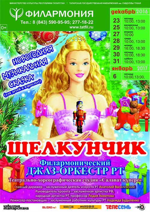 Впервые Филармонический джаз-оркестр РТ подготовил для своей публики новогоднее представление "Щелкунчик" по мотивам сказки Э. Гофмана, музыка П.Чайковского и Д.Эллингтона. Ожидание волшебства живут в каждом из нас, и эта новогодняя история перенесет нас в мир счастливого детства. Современная интерпретация, лихо закрученный сюжет, необычные персонажи удивят публику. В музыкально-театрализованном представлении – художественное слово, вокал, танцевальные и музыкальные номера. За полчаса до представления – традиционный хоровод у елки вместе с Дедом Морозом и Снегурочкой.