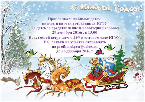 29 ДЕКАБРЯ 2016 Г. В 15.00 Ч. В АКТОВОМ ЗАЛЕ КГЭУ СОСТОИТСЯ НОВОГОДНЕЕ ПРЕДСТАВЛЕНИЕ ДЛЯ ДЕТЕЙ И ВНУКОВ СОТРУДНИКОВ КГЭУ.