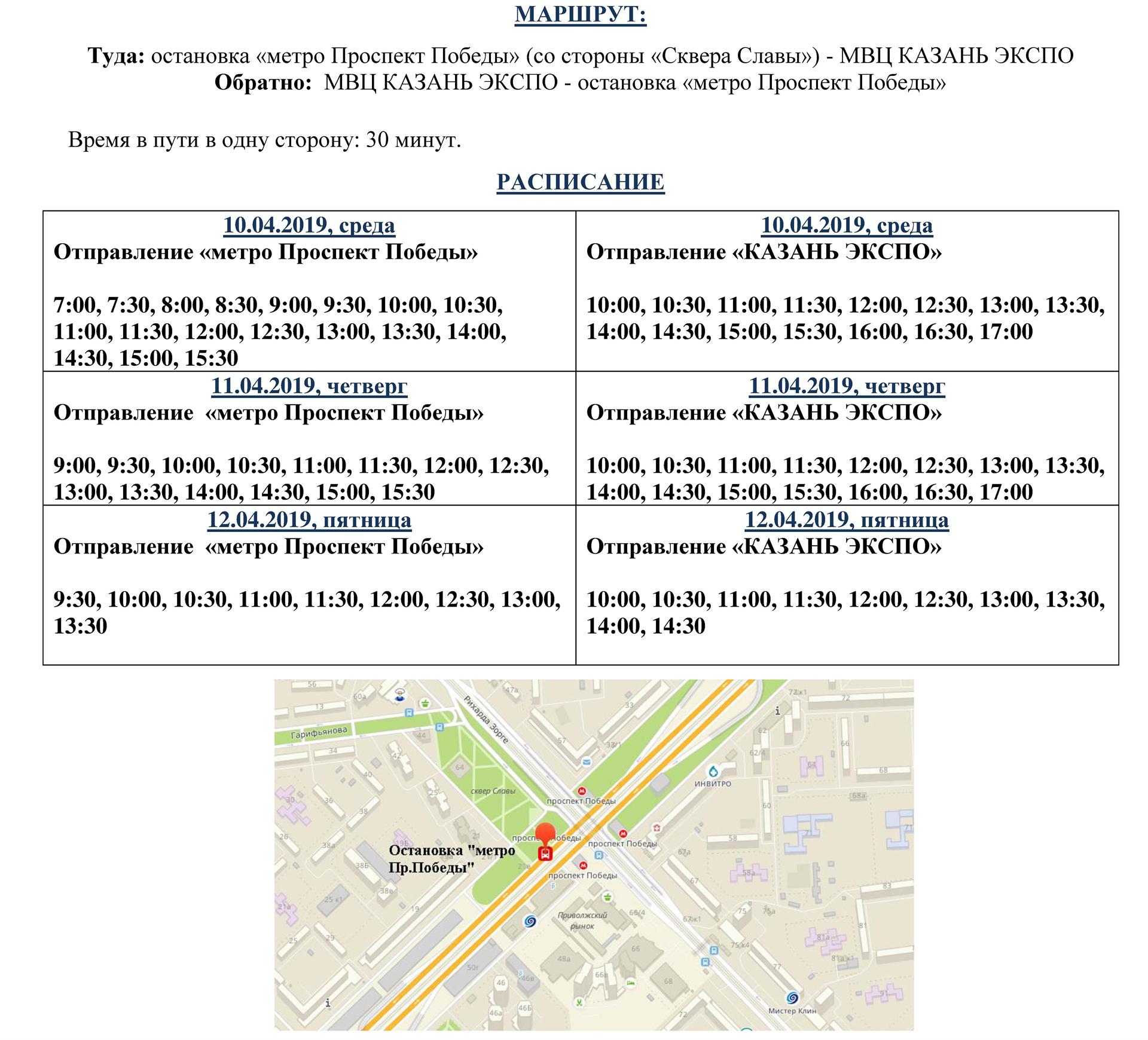 10.04.2019 | 06:15 | КГЭУ – Казань-ЭКСПО (2 пав.) | 150 чел. |