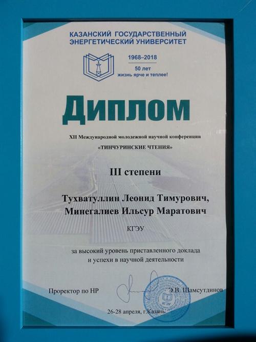 Студенты КГЭУ Тухватуллин Леонид Тимурович и Минегалиев Ильсур Маратович под руководством кандидата педагогических наук, доцента Ибраевой Гульнары Рамилевны были удостоены диплома III степени в рамках XII Международной молодежной научной конференции «Тинчуринские чтения».