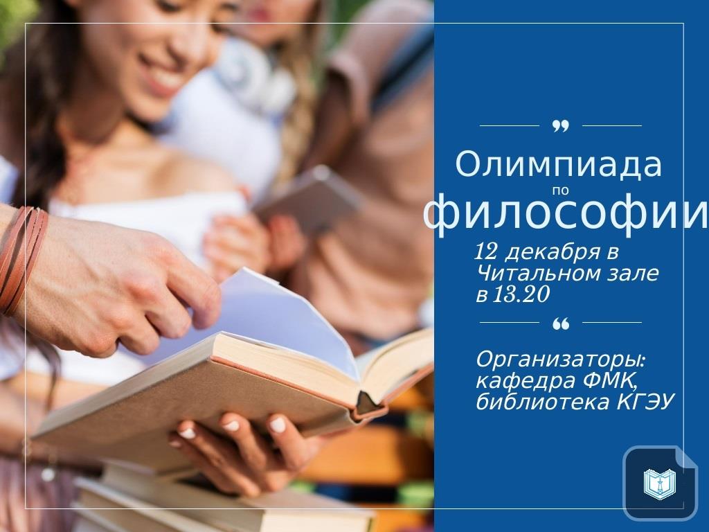 12 декабря в 13.20 в читальном зале КГЭУ пройдет внутривузовская олимпиада по философии среди студентов второго курса. Участникам предстоит пройти испытания на личное и командное первенство. Олимпиада проводится кафедрой "Философия и медиакоммуникации" при содействии библиотеки КГЭУ.