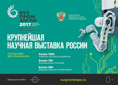 13-14 декабря 2017 года в ЦВК "Экспоцентр" пройдет V ежегодная национальная выставка "ВУЗПРОМЭКСПО-2017", которая демонстрирует новейшие отечественные разработки, созданные в рамках кооперации промышленных предприятий, научно-исследовательских институтов и образовательных организаций высшего образования.