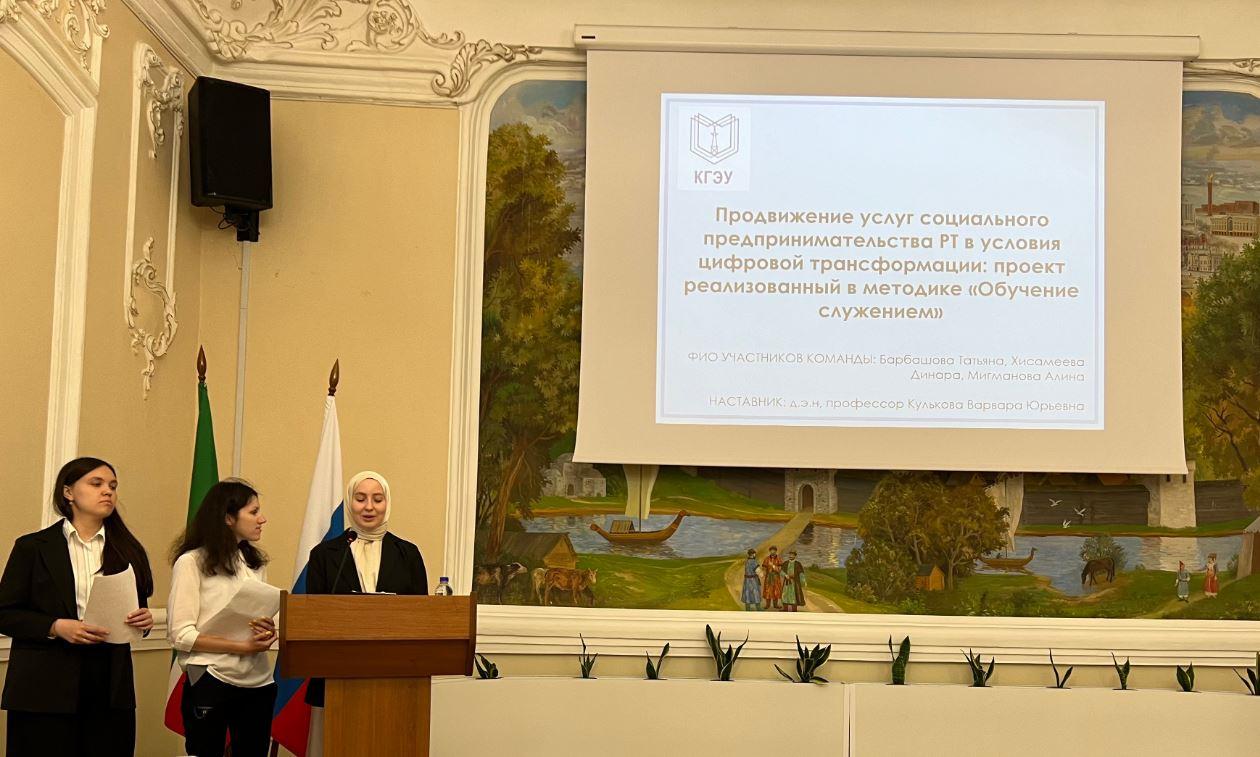 Команда студентов группы ЭУЭ 1-20 Татьяна Барбашова, Динара Хисамеева, Алина Мигманова с проектом «Продвижение услуг социального предпринимательства РТ в условия цифровой трансформации», выполненным в методике обучение служением, стала победителем республиканского конкурса студенческих научных работ и проектов «Молодежь в предпринимательстве: состояние и перспективы» и награждена диплом 1 степени. Наставник проекта - доктор экономических наук, профессор кафедры экономики и организации производства КГЭУ Варвара Юрьевна Кулькова.