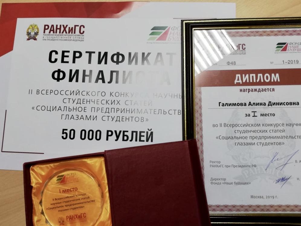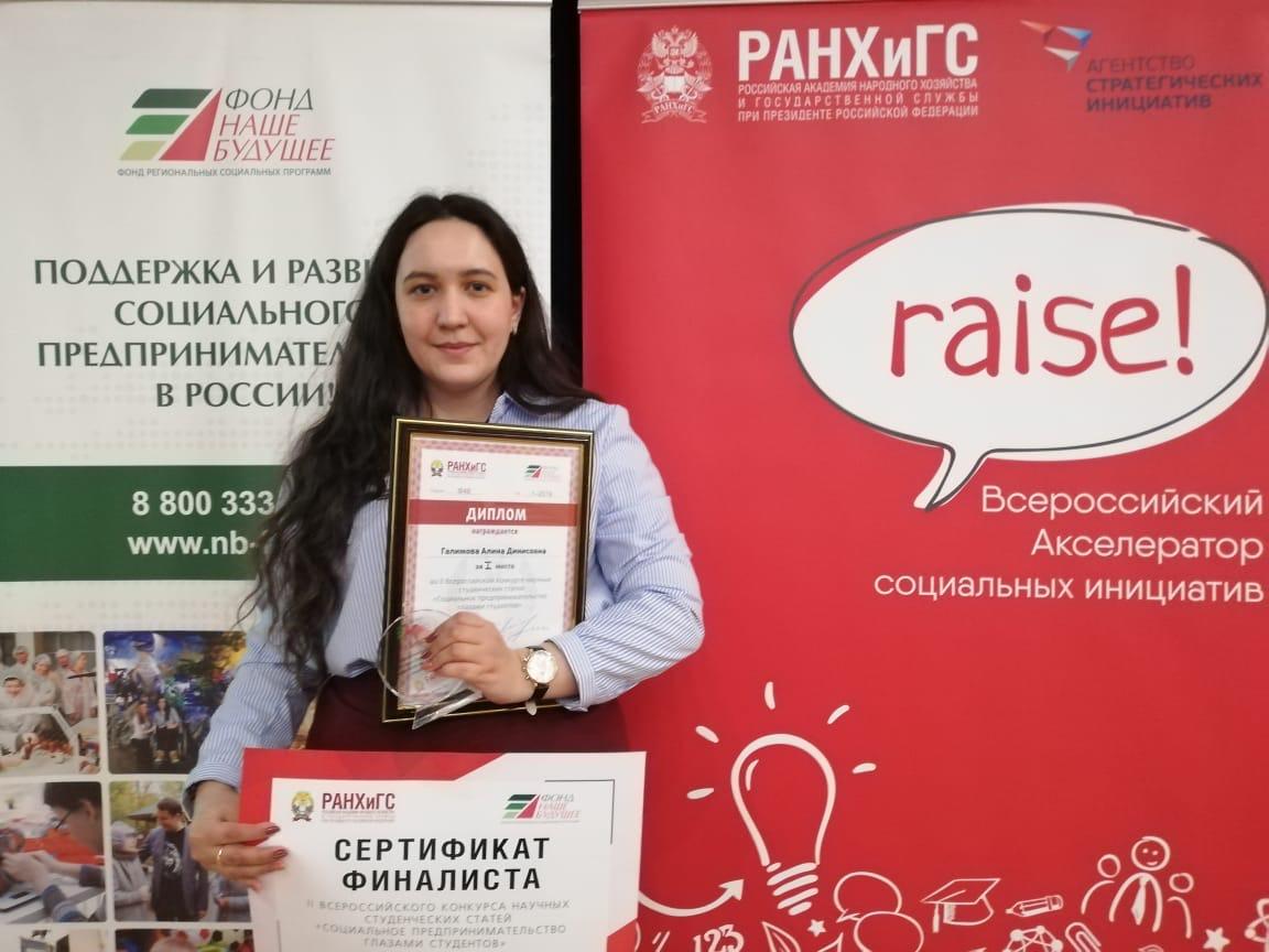 Студентка группы ЭКБ-2-17 Алина Галимова заняла I место во Втором Всероссийском конкурсе научных студенческих статей «Социальное предпринимательство глазами студентов», инициированного РАНХиГС и Фондом «Наше будущее».