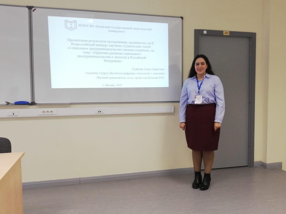 Для участия во Втором Всероссийском конкурсе научных студенческих статей «Социальное предпринимательство глазами студентов» кафедра «Экономики и организации производства» КГЭУ выдвинула три работы, выполненные под научным руководством профессора кафедры В.Ю. Кульковой. В завоевавшей первое место конкурсной работе Алины Галимовой «Практики развития социального предпринимательства в экологии в Российской Федерации» выявлены проблемы и разработаны рекомендации по развитию социального предпринимательства в решении экологических проблем в кейсах социальных проектов «ECOPAD», «Вторник», Эко-корабль «Трофим Яскин».