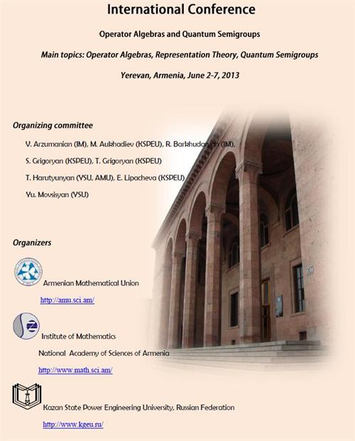 | Workshop on Operator Algebras and Quantum Semigroups (June 03–07, 2013, Yerevan, Armenia) The workshop is devoted to the actual problems of Operator Algebras with applications in Quantum Groups and Semigroups. Main objective is to share results and ideas, joint research projects. The workshop is organized by Armenian Mathematical Union, Institute of Mathematics of RA, Kazan State Power Engineering university. Main topics: Operator Algebras, Representation theory, Quantum Semigroups. Organizing Committee: V. Arzumanian (IM), M. Aukhadiev (KSPEU), R. Barkhudaryan (IM), S. Grigoryan (KSPEU), T. Grigoryan (KSPEU), T. Harutyunyan (YSU,AMU), E. Lipacheva (KSPEU), Yu. Movsisyan (YSU). |