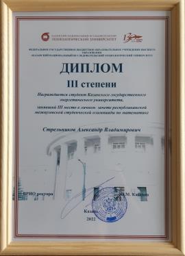 На олимпиаде были представлены четыре команды КГЭУ, и одна из них в командном зачёте заняла второе место, и была награждена Дипломом второй степени. Участники команды: Сергей Шкурпит (группа ПЭ-1-20), Александр Стрельников (группа ЭС-1-20), Кирилл Абдреев (группа ЭС-1-20), Айгиз Каримов (группа ПЭ-1-21), Ярослав Печенкин (группа ЭС-1-21) и Даниил Ченцов (группа ПЭ-1-21). Благодарственные письма получили руководители команд доценты кафедры "Высшая математика" Зольфира Хаписовна Закирова и Алина Владимировна Антонова.
