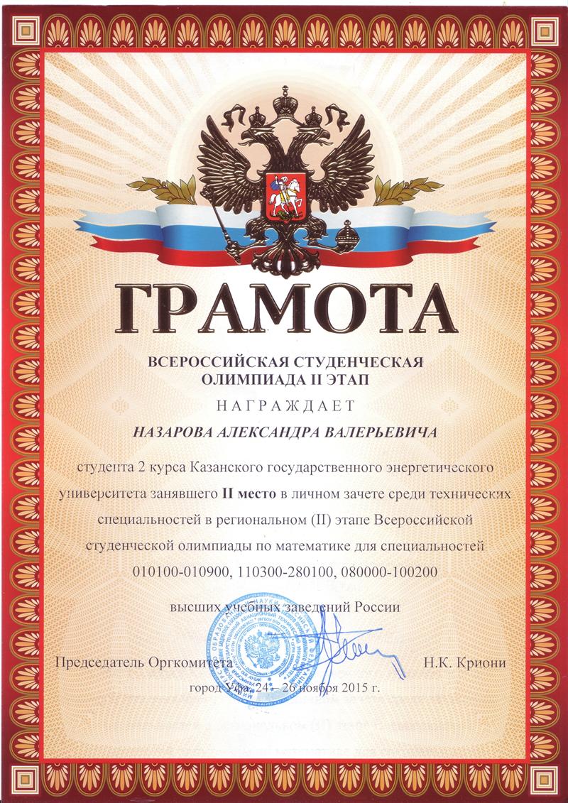 • Назаров Александр, группа ЭЭ-4-14, II место в личном зачете среди технических специальностей, III командное место среди технических специальностей;