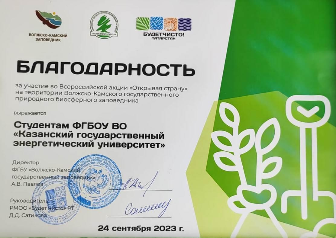 24 сентября во главе с доцентом Мирославой Котляр студенты кафедры «Инженерная экология и безопасность труда» группы ХТ-1-20 Инсаф Гайсин, Алмаз Зарипов, Ибрагимов Азамат, Елизавета Кочеткова, Айнур Салимов, Алмаз Шакиров, а также Хайретдинова Неля и Салихова Гузель (гр. ИЗ-2-23) приняли активное участие во Всероссийской акции «Открывая страну» на территории Волжско-Камского государственного природного биосферного заповедника. По итогам проведенного мероприятия всем участникам объявили благодарность.