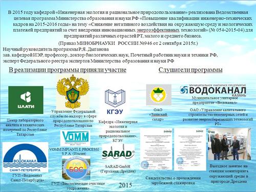 В соответствии с Приказом Министерства образования и науки РФ №946 от 2.09.2015 кафедра «Инженерная экология и рациональное природопользование» с 15.09.15 по 29.11.15 участвует в реализации ведомственной целевой программы «Повышение квалификации инженерно-технических кадров на 2015-2016 годы» с образовательной программой «Снижение негативного воздействия на окружающую среду и экологических платежей предприятий за счет внедрения инновационных энергоэффективных технологий».