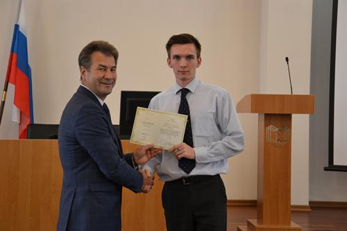 Вручение свидетельства (слева на право): Проректор по НО Ильин В.К.; слушатель курсов Фахреев Н.Н.