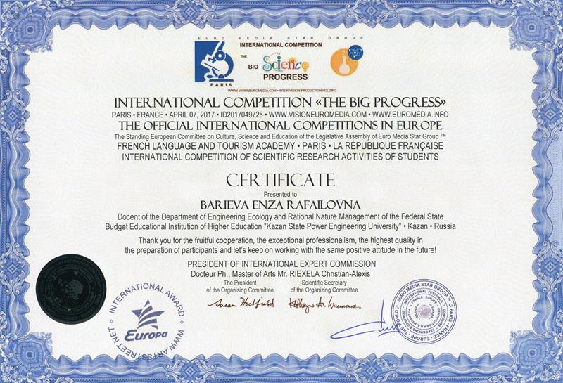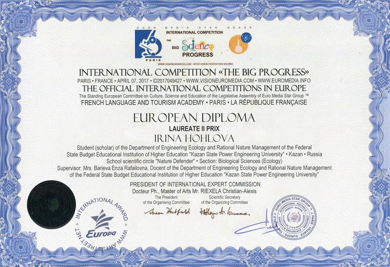 В нем участвовали 871 человек из Германии, Франции, Австрии, Чехии, Великобритании, Российской Федерации и других стран. В этом конкурсе приняли участие члены Школьного научного кружка «Защитник природы» кафедры «Инженерная экология и рациональное природопользование» КГЭУ Альберт Королёв и Ирина Хохлова (науч.рук. доцент Э.Р. Бариева). По результатам конкурса Альберт Королёв стал лауреатом I степени, Ирина Хохлова лауреатом II степени.