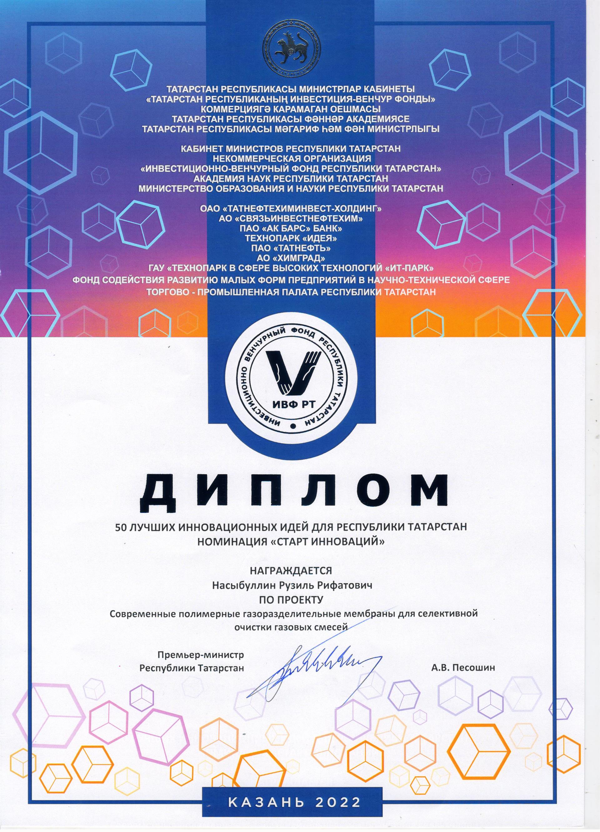 Студенты группы МВТМ-1-19 стали победителями конкурса «Пятьдесят лучших инновационных идей для Республики Татарста". 1. Насыбуллин Рузиль с темой проекта «Современные полимерные газоразделительные мембраны для селективной очистки газовых смесей». 2. Слюднева Диана с темой проекта «Метод in-situ для производства композиционных материалов на керамической основе». 3. Рахматуллин Булат с темой проекта «Металлокомплексное структурирование гетероцепных полимеров для придания электрических свойств».