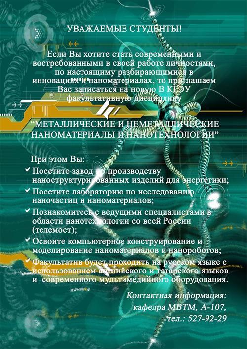 Впервые в КГЭУ кафедра МВТМ начала факультативный курс "МЕТАЛЛИЧЕСКИЕ И НЕМЕТАЛЛИЧЕСКИЕ НАНОМАТЕРИАЛЫ И НАНОТЕХНОЛОГИИ В ЭНЕРГЕТИКЕ".