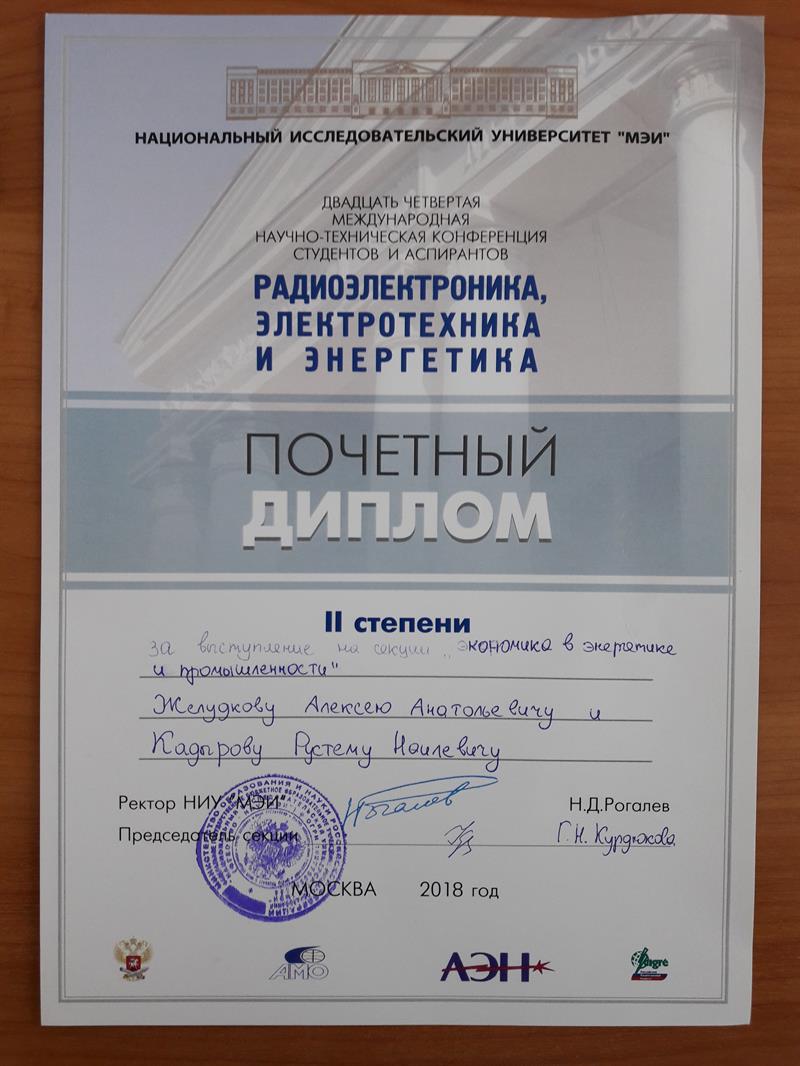 Магистрант кафедры ЭПП Желудков Алексей под руководством научного руководителя доцента к.т.н. Саитбаталовой Р.С. был награжден дипломом 2 степени за высокий научный уровень доклада на Международной научно-технической конференции студентов и аспирантов в НИС "МЭИ" Поздравляем!!!!!