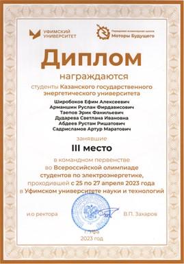 В индивидуальном зачете студенты кафедры «Электрические станции им. В. К. Шибанова» Садрисламов Артур и Широбоков Ефим были отмечены дипломами I степени, Дударева Светлана – дипломом III степени.