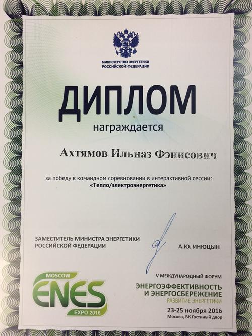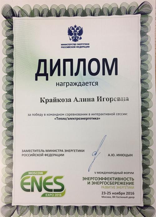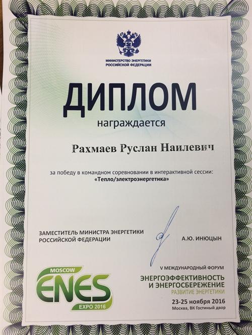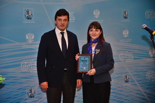 Замминистра энергетики Инюцын А.Ю. вручил ассистенту кафедры "Электрические станции им. В.К. Шибанова" Эльмире Рашитовне Гайфутдиновой диплом II степени за проект "Разработка новых устройств для защиты оборудования ОРУ электростанций и подстанций от волн грозовых перенапряжений, набегающих с воздушных линий электропередачи" во Всероссийском конкурсе молодёжных разработок и образовательных инициатив в сфере энергетики в номинации: "Лучшие молодежные научно-исследовательские, инновационные разработки в области энергетики и промышленные образцы и энергоэффективности, созданные молодыми специалистами компаний и организаций, молодыми учёными и студентами". Работа была выполнена под руководством профессора кафедры ЭС А.Е.Усачева