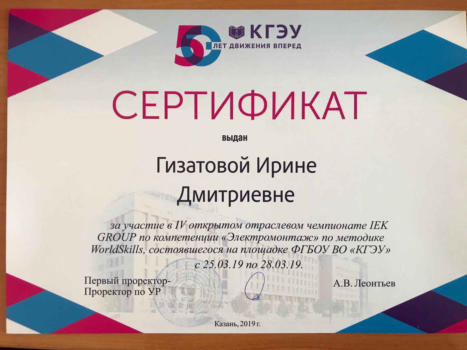 Вручение сертификата за участие в IV открытом отраслевом чемпионате IEK Group по компетенции "Электромонтаж" по методике WorldSkills
