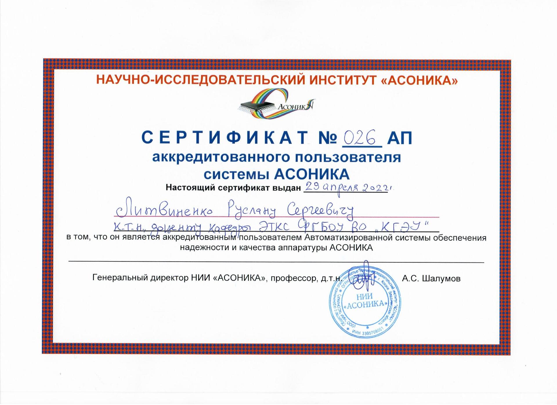 В период с 25.04.2022 по 29.04.2022 в «Центре компетенций в области моделирования и виртуальных испытаний электронной компонетной базы (ЭКБ) и электронной аппаратуры на внешние воздействия» на базе ООО «НИИ «АСОНИКА» сотрудники кафедры ЭТКС прошли обучение и получили сертификаты аккредитованного пользователя Автоматизированной системы обеспечения надежности и качества аппаратуры АСОНИКА.