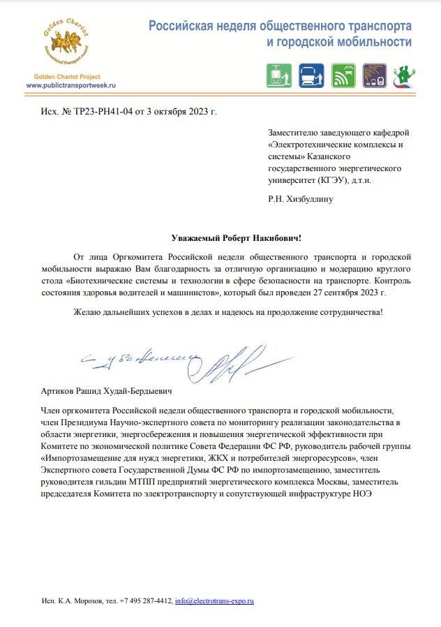 27- 29 сентября в Москве состоялась 12-я Международная выставка «Электротранс-2023». Заведующий кафедрой «Электротехнические комплексы и системы» Павел Павлов и профессор кафедры Роберт Хизбуллин приняли участие в важном отраслевом мероприятии, посвященной общественному электрическому транспорту и сопутствующей инфраструктуре.