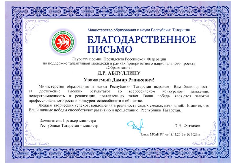 7 декабря 2016 года в здании Театра юного зрителя (ТЮЗ) состоялась торжественная церемония награждения талантливой молодежи Республики Татарстан в рамках приоритетного национального проекта «Образование».