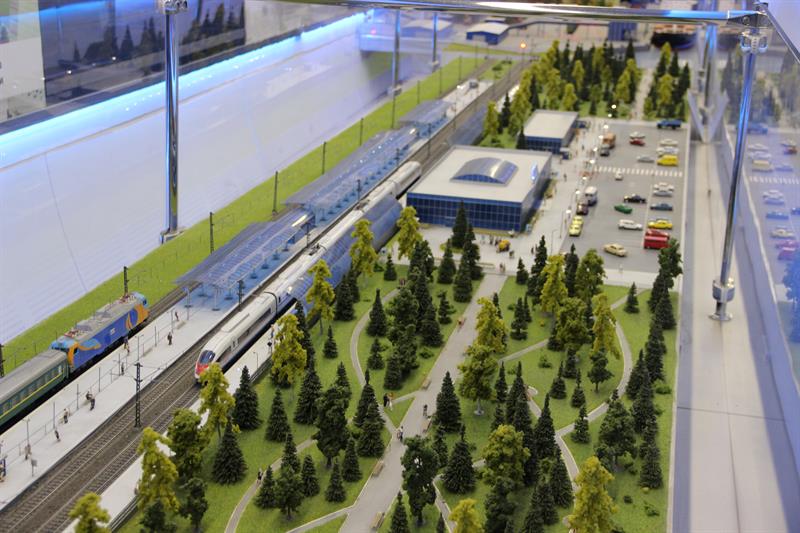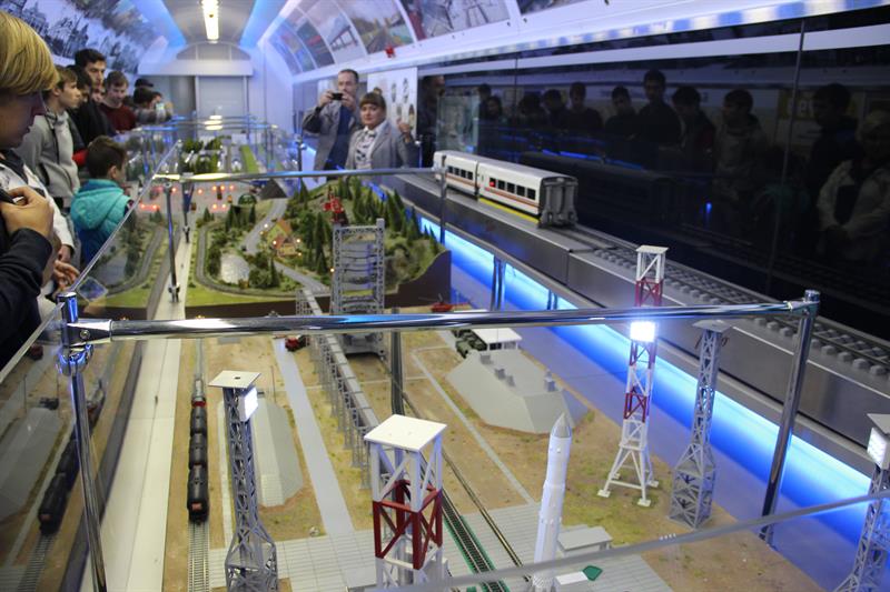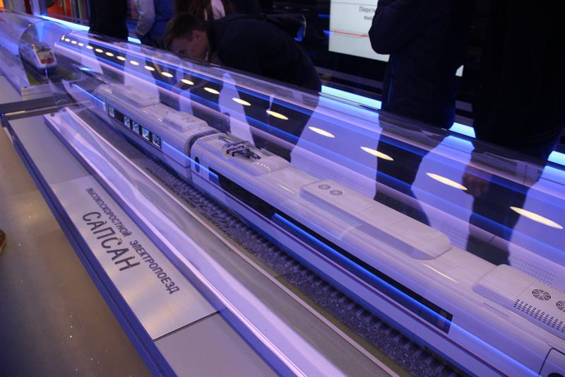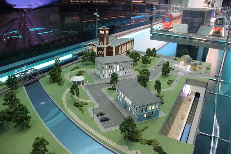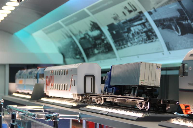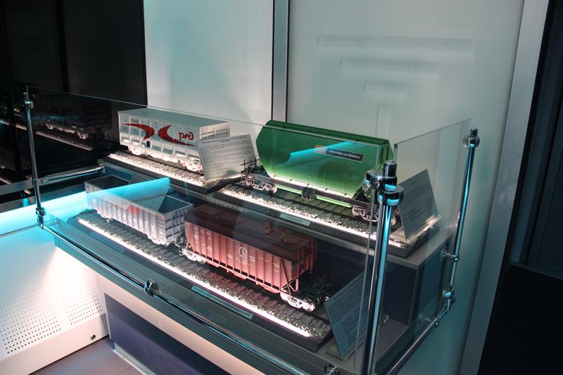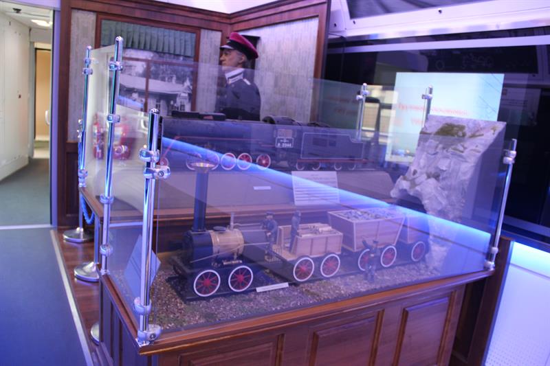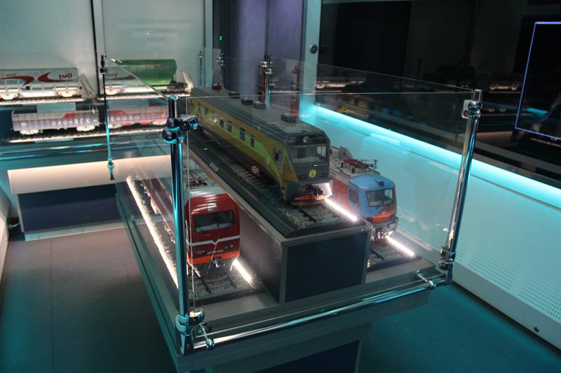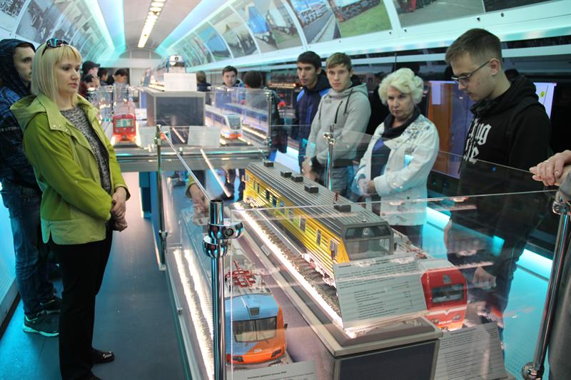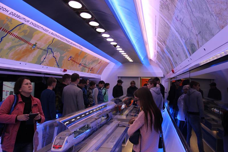 В выставочных вагонах представлены макеты современного подвижного состава: газотурбовоза, грузового вагона для перевозки угля, пассажирских электровозов, тепловоза, двухэтажного пассажирского вагона. Здесь можно познакомиться с историей развития отечественного железнодорожного транспорта, а также с современной инфраструктурой железнодорожной сети страны. В частности, демонстрируются уменьшенные копии железнодорожного терминала аэропорта Адлера и железнодорожного комплекса на космодроме «Байконур».