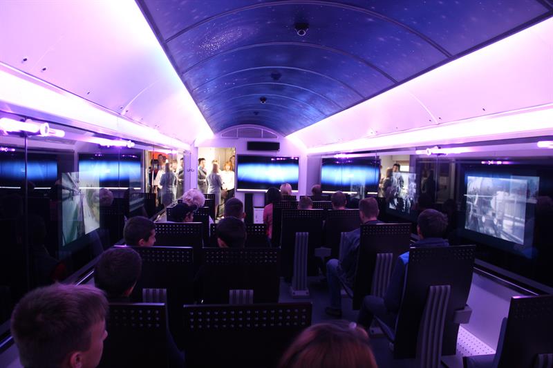 Поезд-музей включает 8 выставочных вагонов, каждый из которых посвящен какому-либо инновационному проекту или компании, представляющей свои проекты: ОАО «РЖД» − «Развитие скоростного и высокоскоростного движения в России», «Подвижной состав российских железных дорог», «Инфраструктура железных дорог», «Молодежная и кадровая политика», «Тренажерные комплексы железных дорог», «Энергосбережение, энергоэффективность и экологическая безопасность», «Конференции и лекции»; госкорпорации «РОСНАНО» − «Нанотехнологии»; госкорпорации «Росатом» − «Современные ядерные технологии».