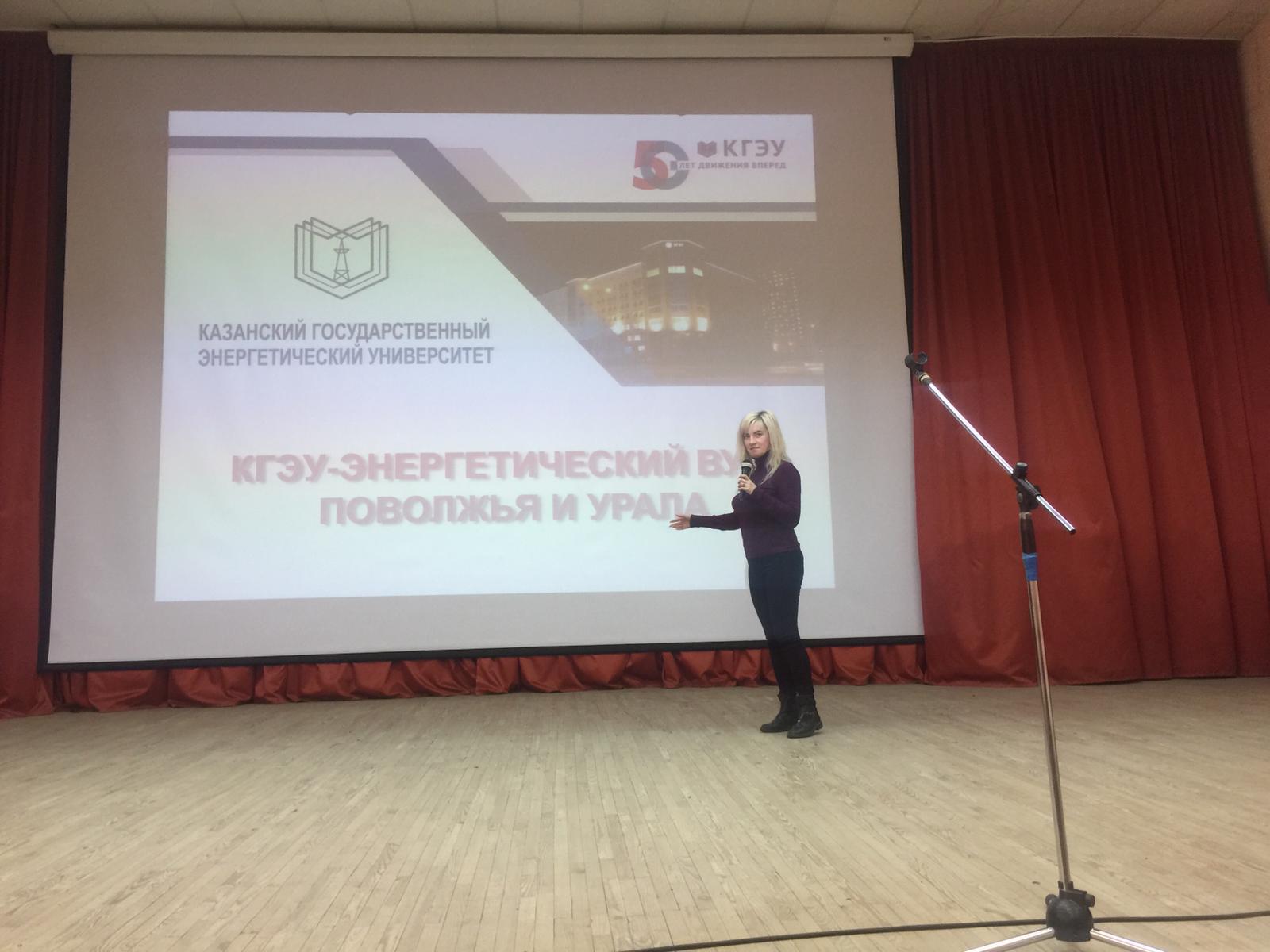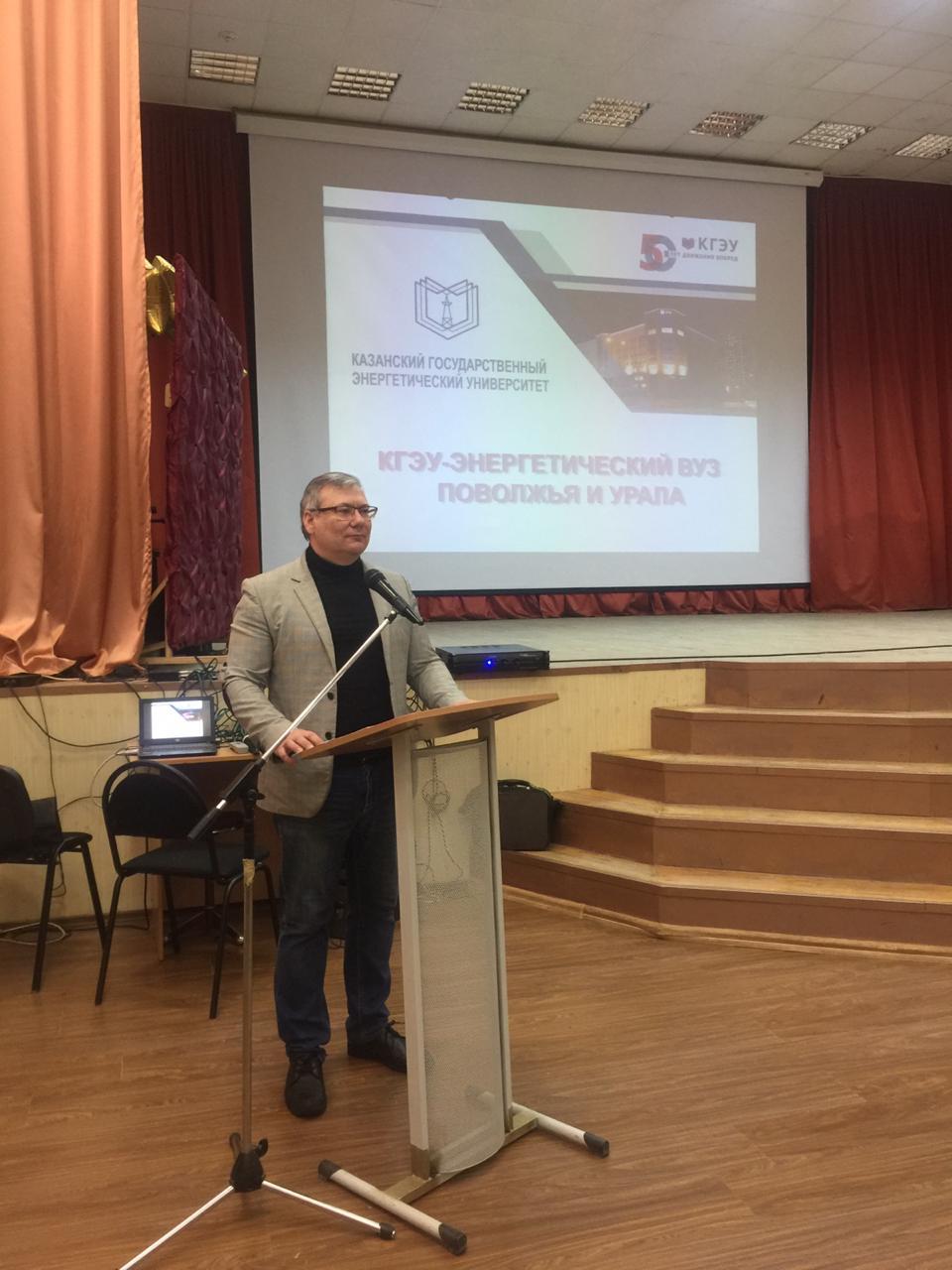 Доцент  Хизбуллин Р.Н. и преподаватель Антипанова И.С. провели профориентационную работу среди учащихся 9-11 классов школ г. Зеленодольска. Показаны презентация и  видеоролик о Казанском государственном энергетическом университете, представлена информация о специальностях ВУЗа, стипендиях и условиях поступления.