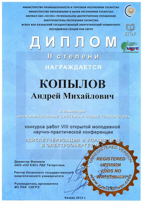Магистрант кафедры ЭХП Копылов Андрей Михайлович и был награжден ДИПЛОМОМ II степени в конкурсе работ VII открытой молодежной научно-практической конференции "ДИСПЕТЧЕРИЗАЦИЯ И УПРАВЛЕНИЕ В ЭЛЕКТРОЭНЕРГЕТИКЕ" в номинации "Информационные системы и новые технологии"