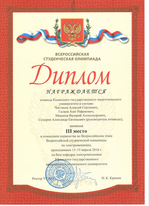 После прохождения всех этапов наша команда была удостоена III места в командном первенстве во Всероссийском этапе Всероссийской студенческой олимпиады по электромеханике.
